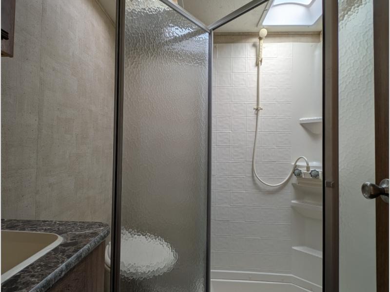 Head up the steps to the right of the entry door and enjoy the convenience of a side aisle bath on your left. The bath features an angled shower, toilet, sink, and linen cabinet. Continued down the hall and find a private front bedroom with queen size bed, dual bedside closets and nightstand, plus so much more!