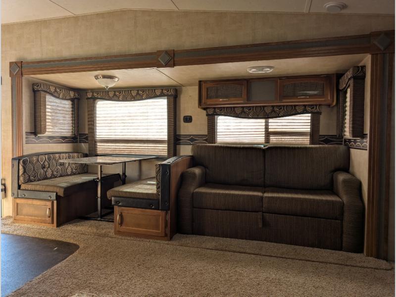 To the left of the entry door there is a booth dinette and tri-fold sofa which can easily create additional sleeping space at night and provides ample seating during the day for meals, watching television, or just hanging out.
