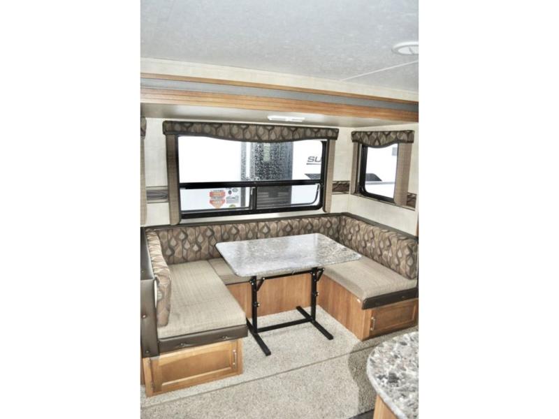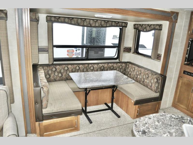 There is a u-shaped dinette slide opposite the door for added walking around space inside. There is also an entertainment center nearby for your enjoyment.