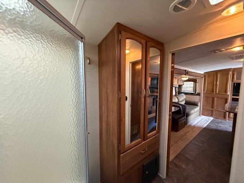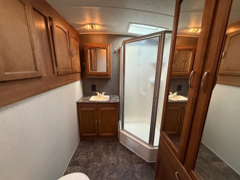 Head to the rear of the unit where you will find a spacious bath which provides an angled shower, toilet, sink, double door linen cabinet just inside the door, and also more storage above the toilet area along the wall.