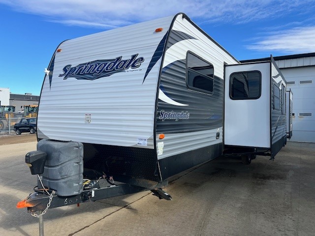 This spacious Springdale travel trailer 38FL offers many of the comforts of home featuring a front living area including a fireplace, dual slides for added interior space, and dual entry doors.