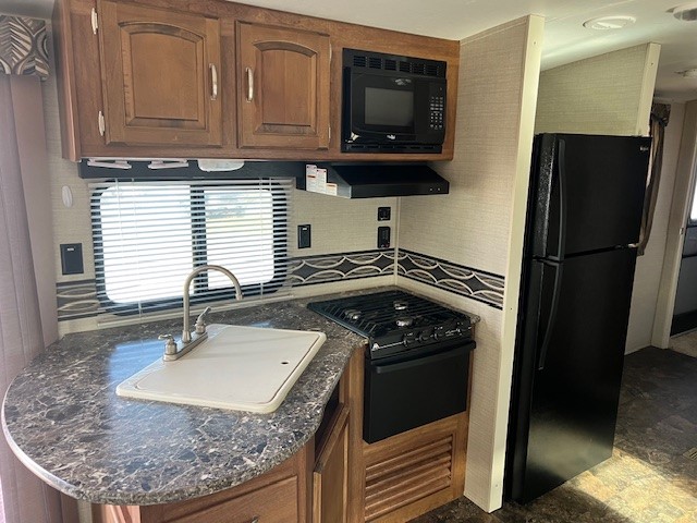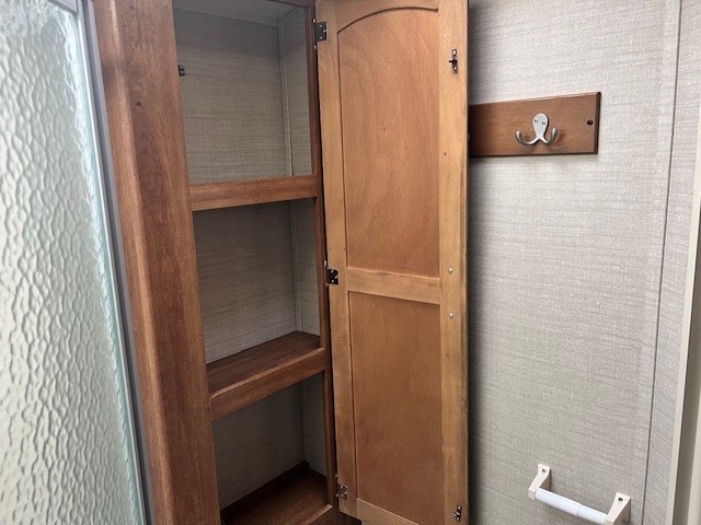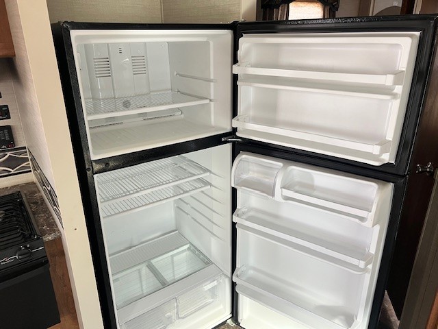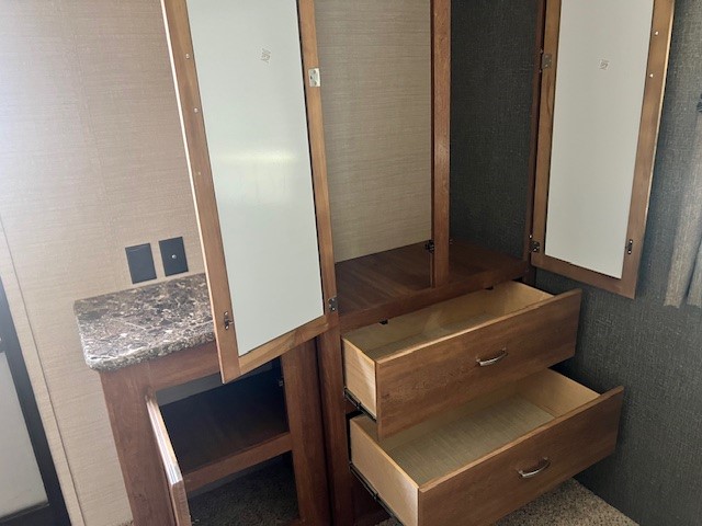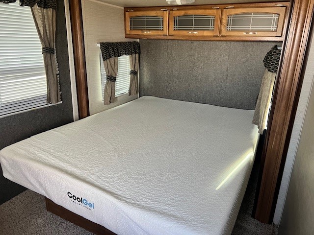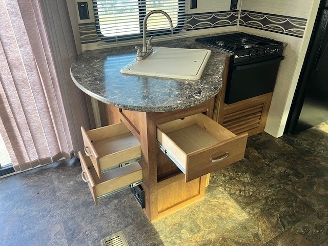 The kitchen offers all that you need to prepare and cook for for your hungry crew while camping. There is a large kitchen sink making cleaning up easy, a three burner range, overhead microwave oven, refrigerator, and two pantries for dry good and canned good storage.