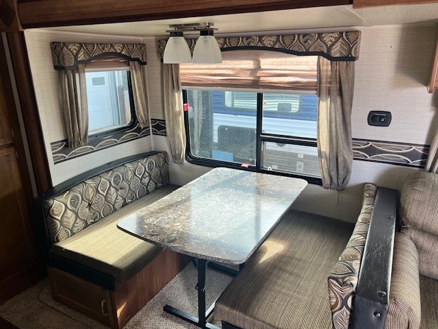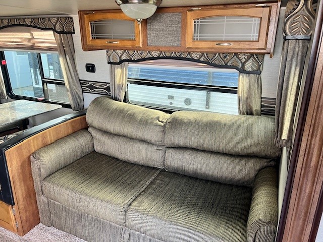 Straight in from the patio door there is a slide out tri-fold sofa with overhead storage and a booth dinette. Both of which provide even more seating, and can easily be made into more sleeping space if needed at night.