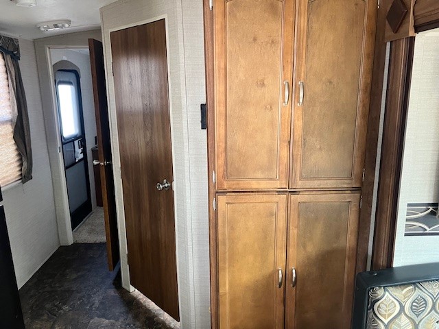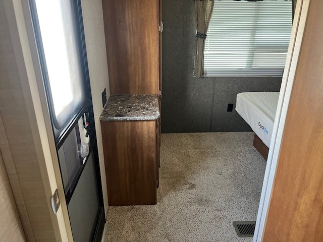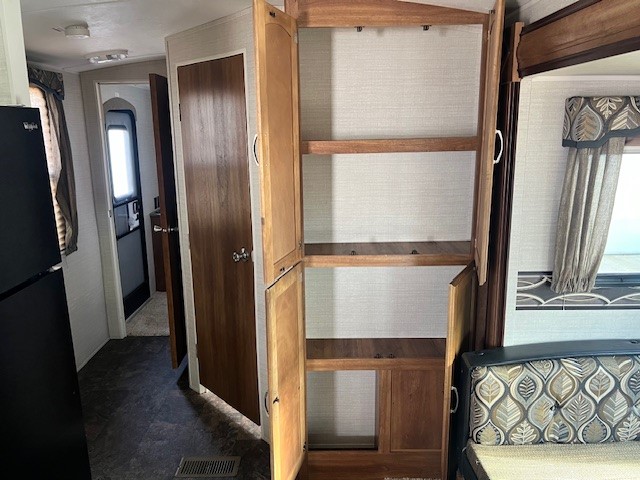The rear of this Springdale travel trailer features a queen bed slide, wardrobe with double doors and entertainment center both along the curbside wall opposite the bed next to a private entry door, plus so much more!