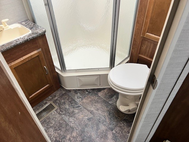The bath features a corner shower, toilet, sink, and linen cabinet.