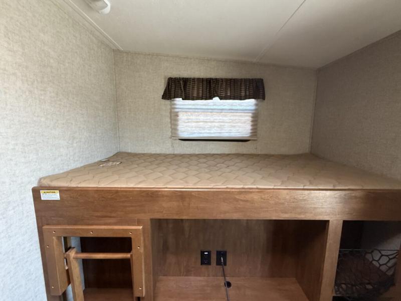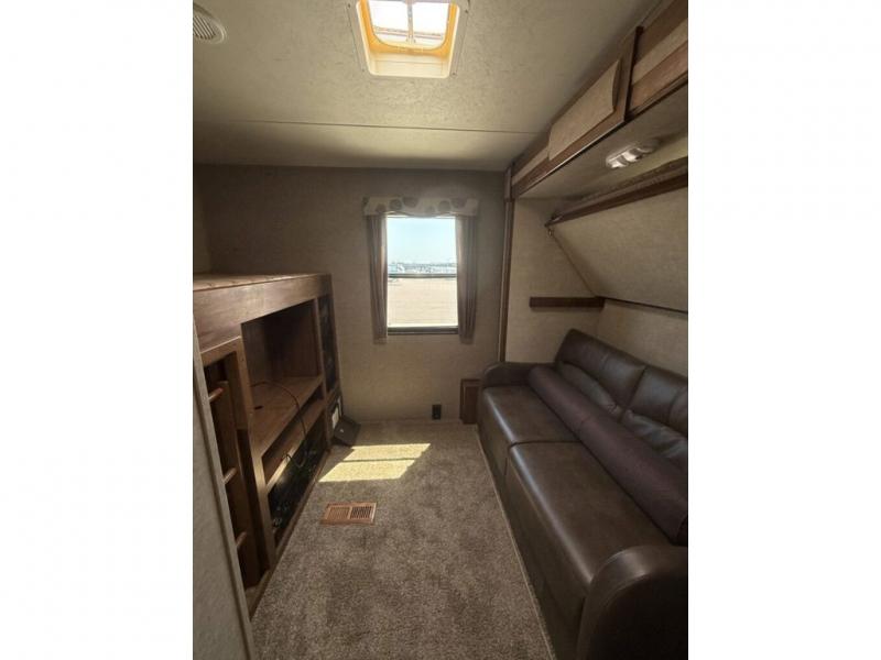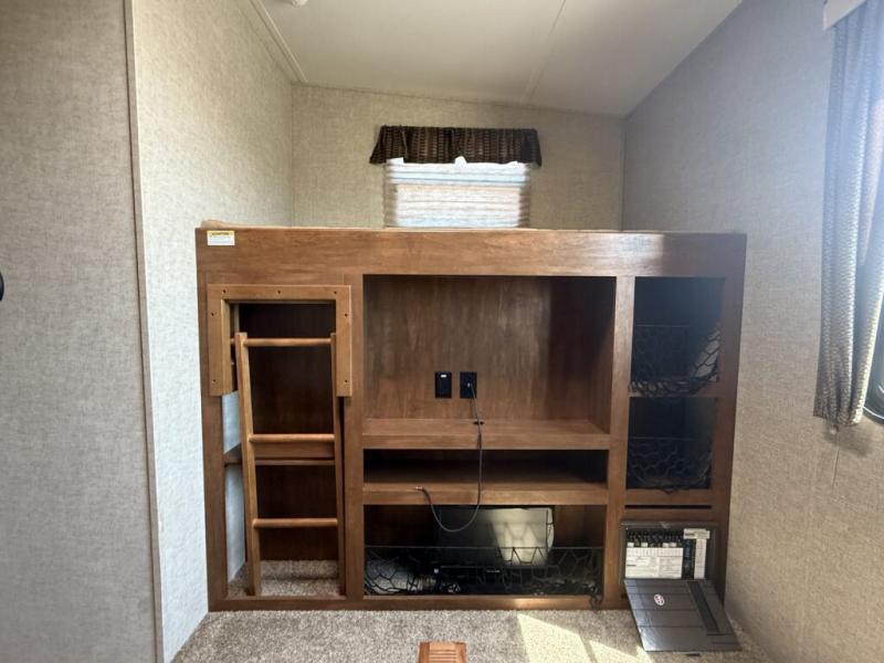 The rear bunkhouse features a flip-over sofa slide with bunk above and three drawers beneath. On the left side find a lower bunk with toy box, a 36" x 74 bunk in the middle, and an overhead bunk above making this private bunk space easily sleep five!
