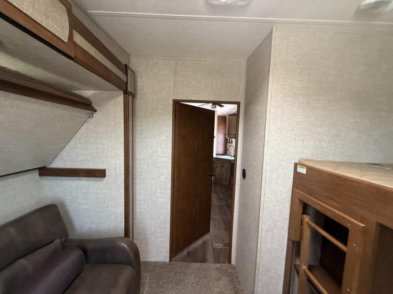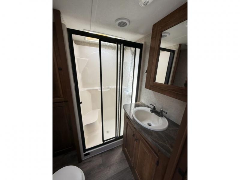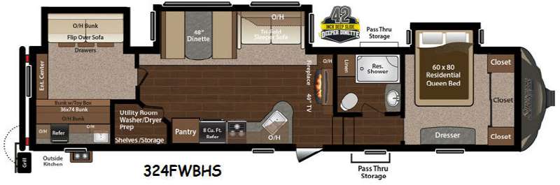 Keystone's Sprinter 324FWBHS fifth wheel with its wide body design has enough space for everyone with a bunkhouse that the kids will love, a spacious living room with deep 42" slide, a fireplace, and more. There is even an outdoor kitchen for added convenience, and a utility room that has been prepped for a washer and dryer!