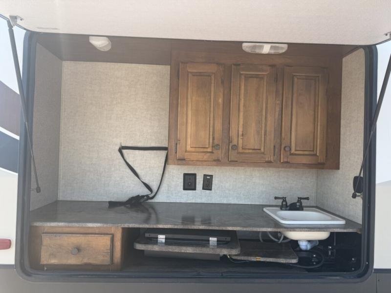 The rear outdoor kitchen is the perfect feature for those who love to cook and dine outdoors. There is a stove with two burners, a single sink, refrigerator, counter space and overhead storage, plus a bumper mount grill that can swing around, and so much more!