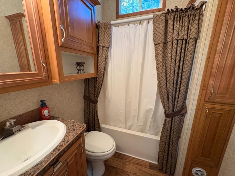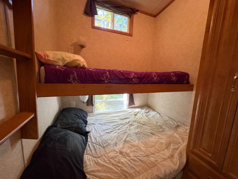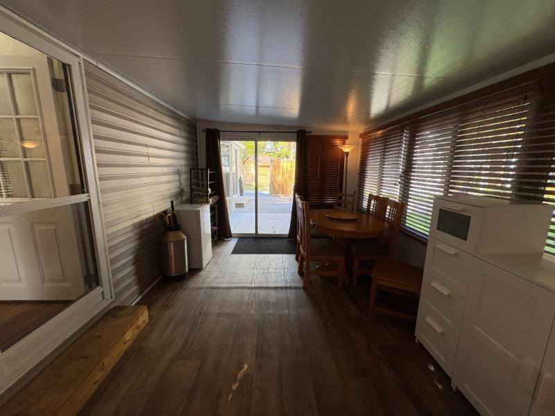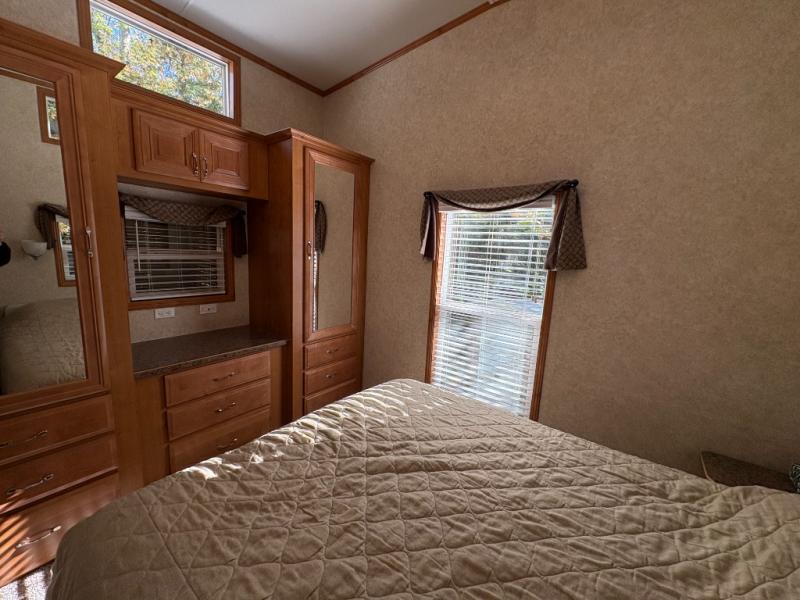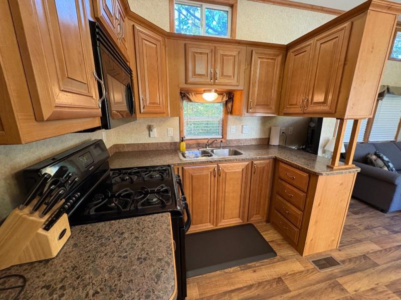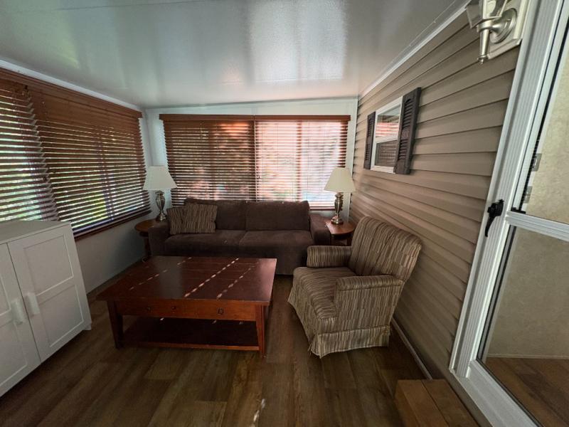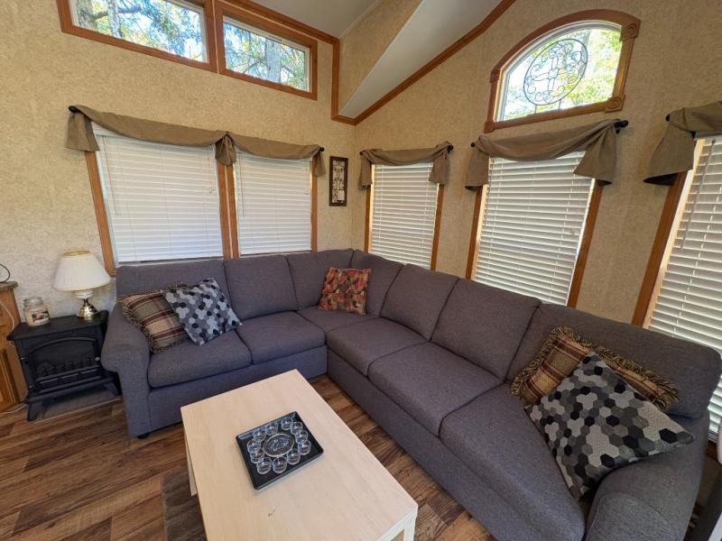 FOR SALE IN THE PARKThis 2015 Kropf Canadian Lakeside 44’ model with a spacious 10’ x 20’ Florida room offers the perfect cottage. Open concept kitchen, living and dining space with modern finishes and a well-thought-out layout with 2 bedrooms—a queen master suite and a second bedroom featuring bunk beds with a double and twin for family or guests. The bright and open living space flows seamlessly into the Florida room, providing plenty of space to relax or entertain. Step outside to a 10’ x 12’ deck, ideal for morning coffee or evening BBQs overlooking the park. Two sheds provide extra storage for all your seasonal gear. This site shows true pride of ownership and has been lovingly maintained.