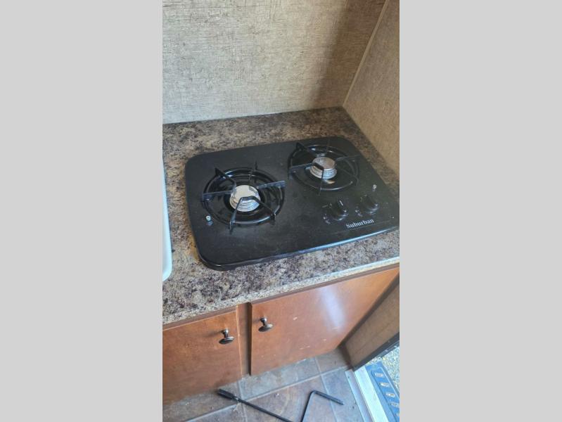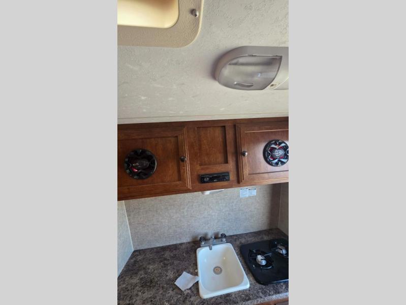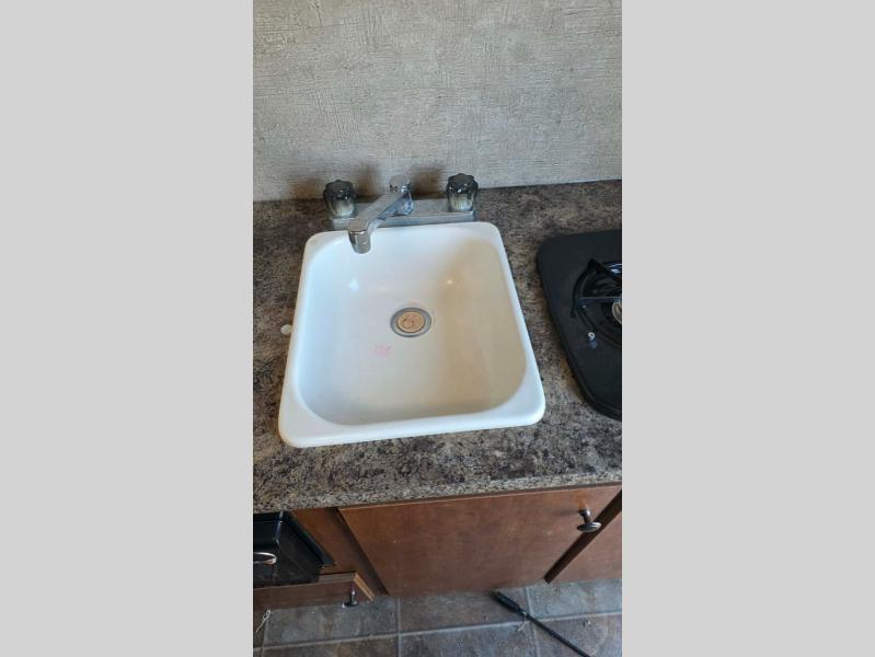 In the front, is a two burner range, and single sink surrounded by ample counter space.