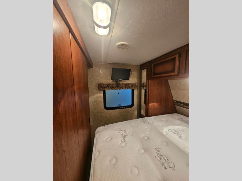 In the rear there is a bunk house. You will find a wardrobe, TV, sofa with flip-up bunk above the sofa and a set of bunks.