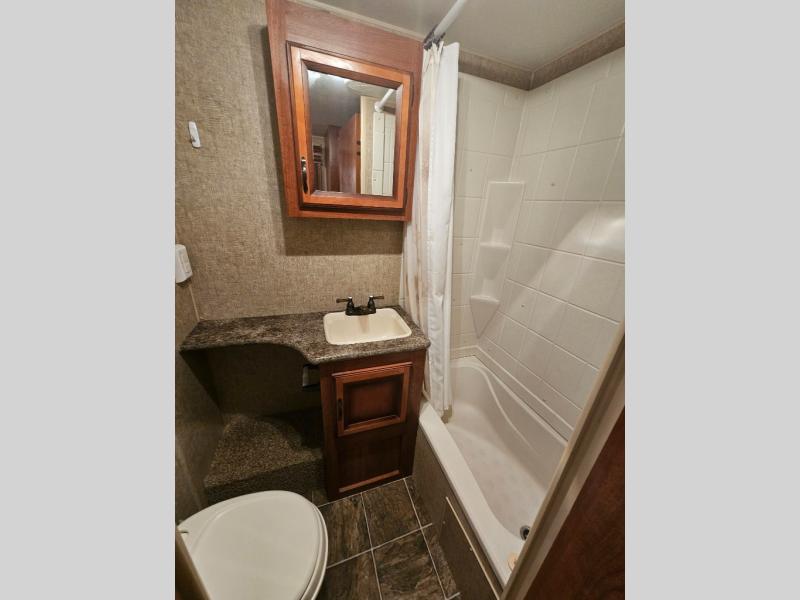 Towards the rear of the travel trailer is the bathroom. The bathroom has a toilet, sink, and shower.