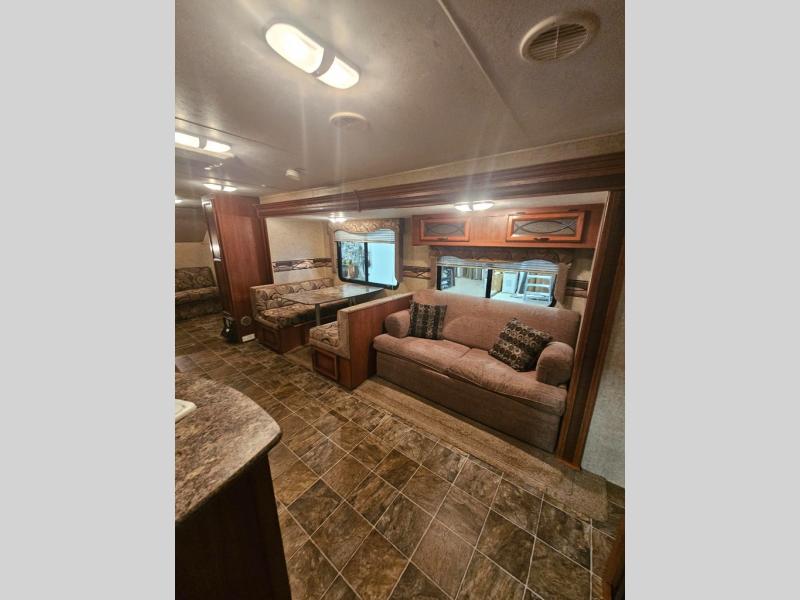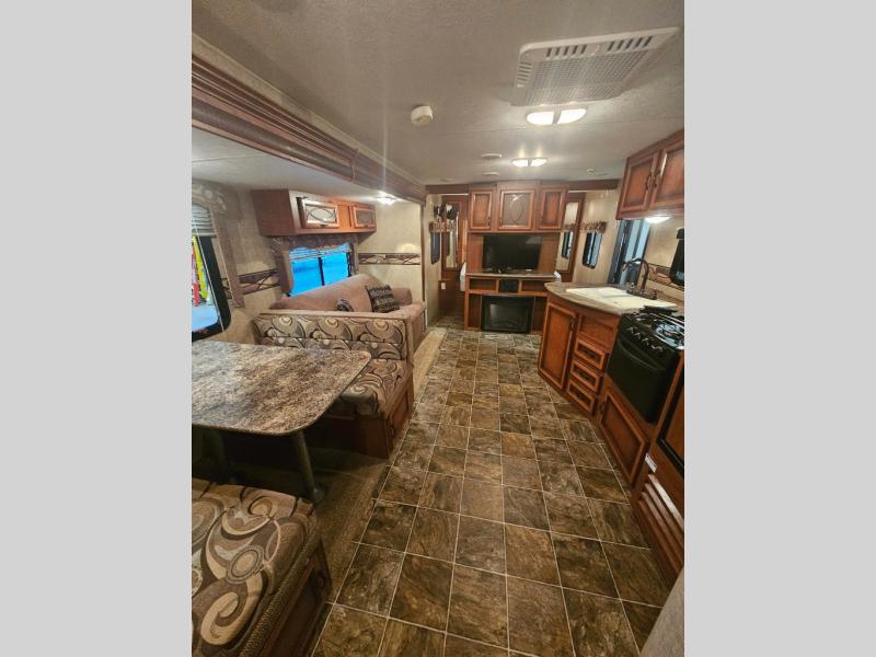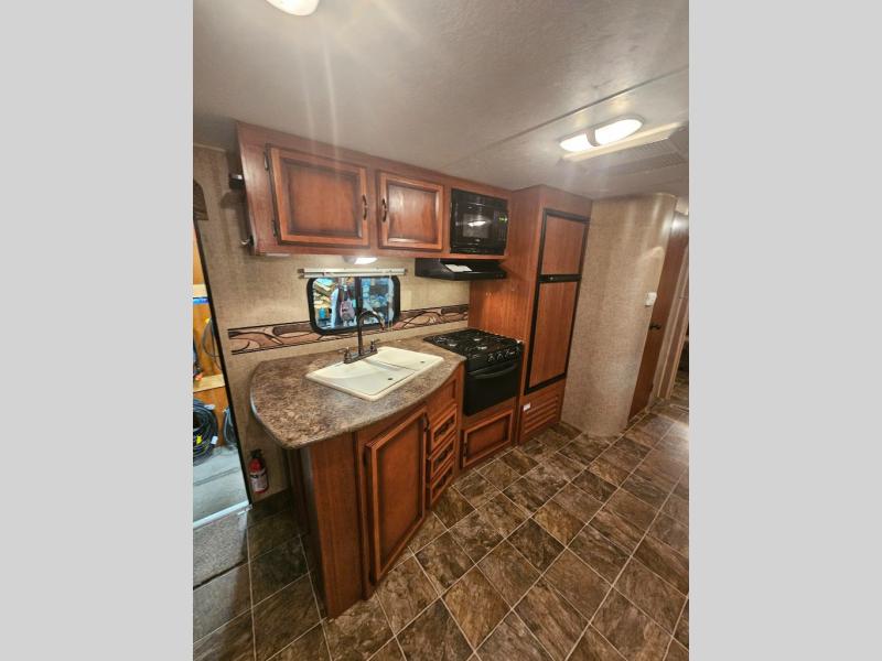 As you enter the travel trailer, to the left there is a double kitchen sink, three burner range, and refrigerator. The opposite side of the travel trailer offers a slide with a dinette and sofa. In the front of the living area there is a nice size entertainment center.