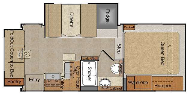 Step up to a cabover queen size bed in front with large wardrobe on the right. Overhead cabinets are found all along the left side wall, and a convenient hamper is located on the right to help you keep things neat and organized.