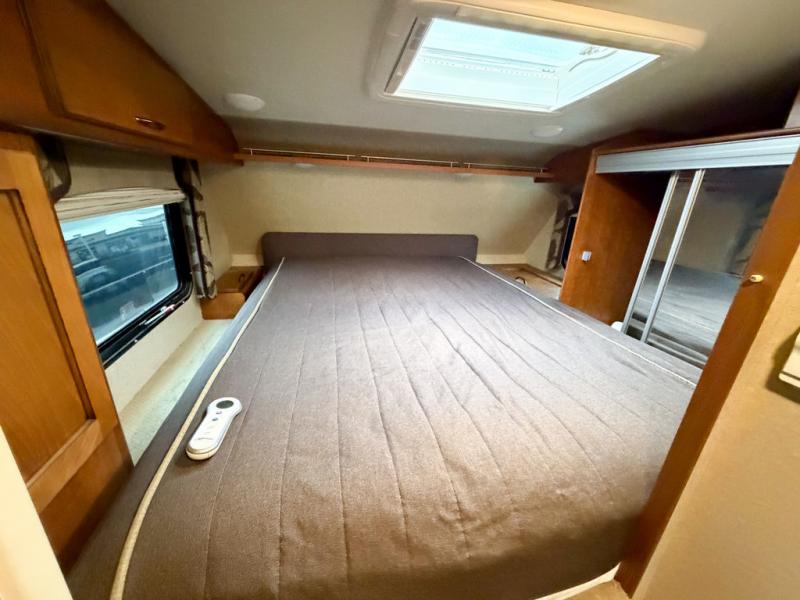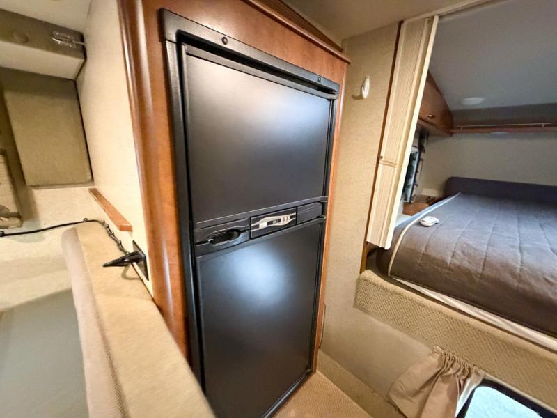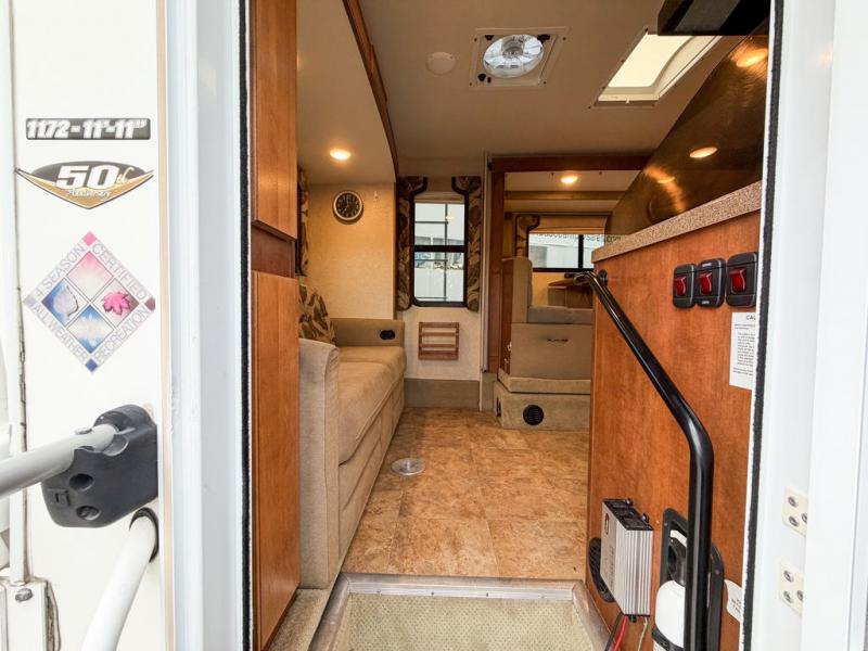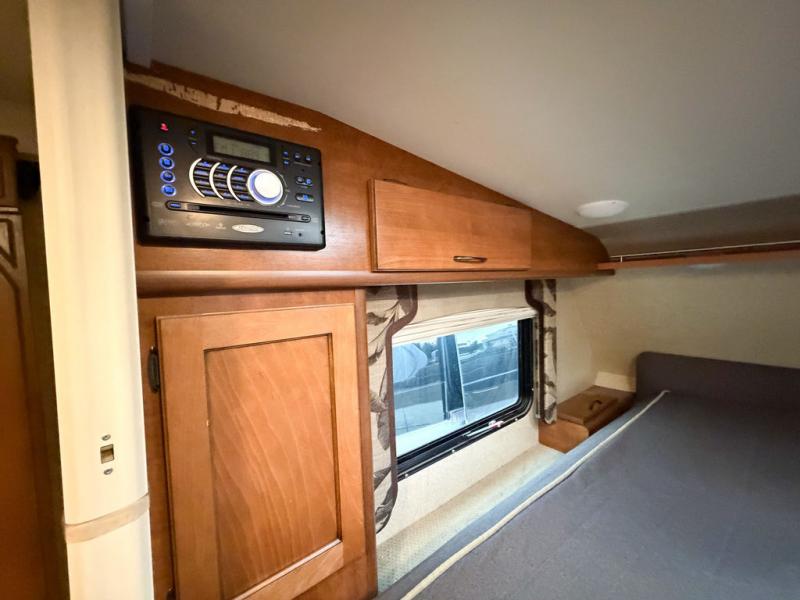 Step up to a cabover queen size bed in front with large wardrobe on the right. Overhead cabinets are found all along the left side wall, and a convenient hamper is located on the right to help you keep things neat and organized.
