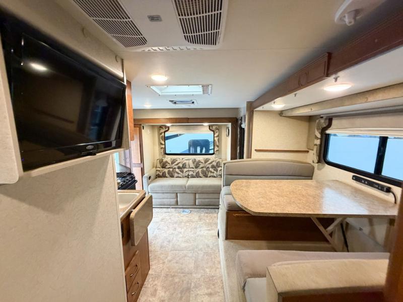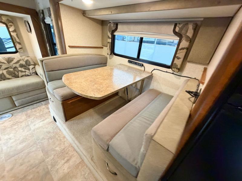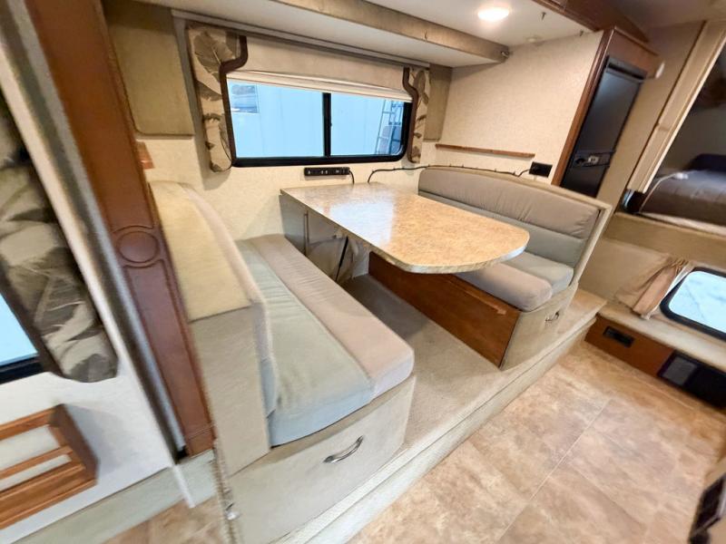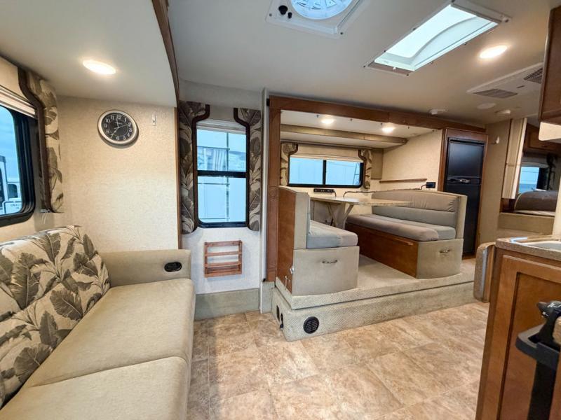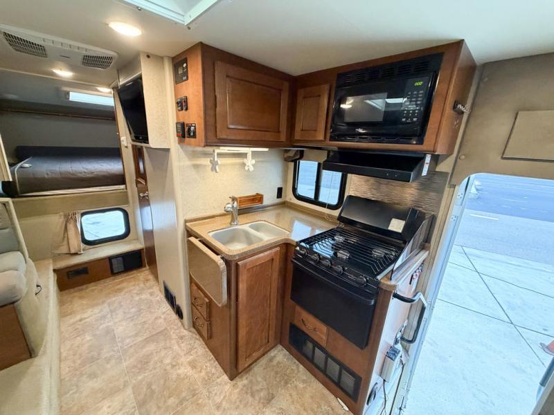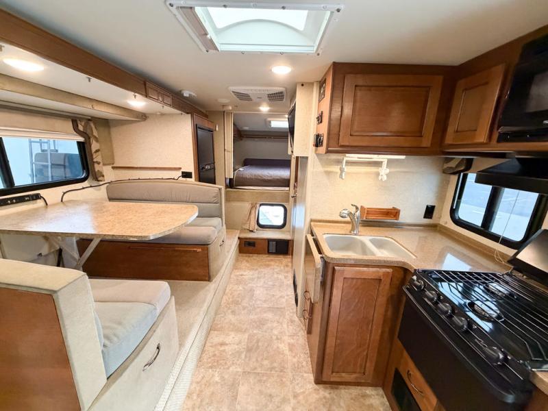 The kitchen area offers everything you need to easily prepare and cook food while you are adventuring. There is a three burner range, double kitchen sink, overhead storage, and refrigerator on the opposite side near the dinette.