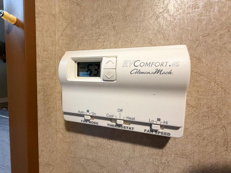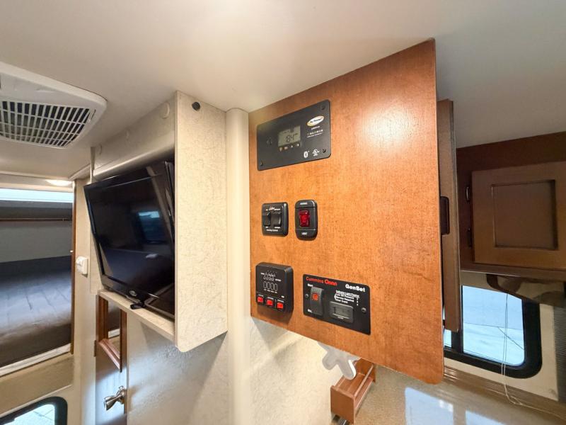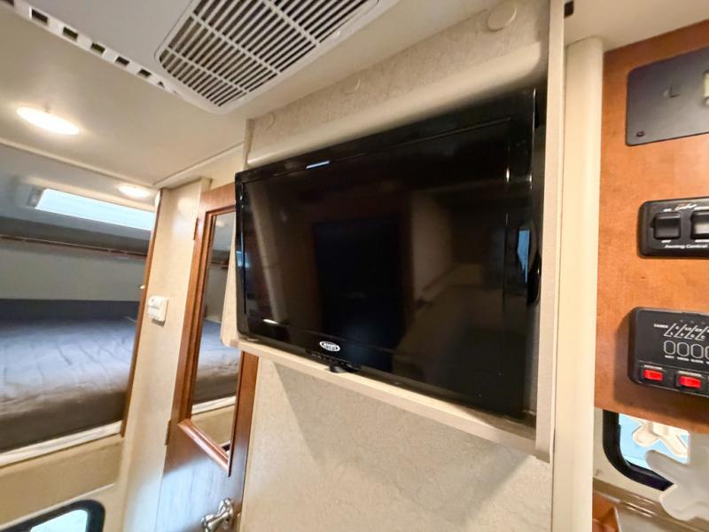 Across from the dinette along the outer bathroom wall find a entertainment center which will allow you to add an optional 24" 12 volt LED TV.