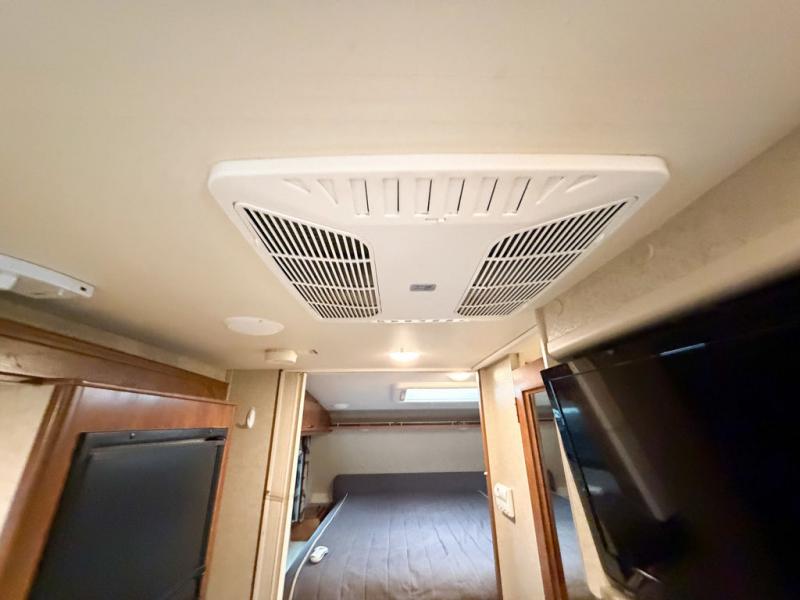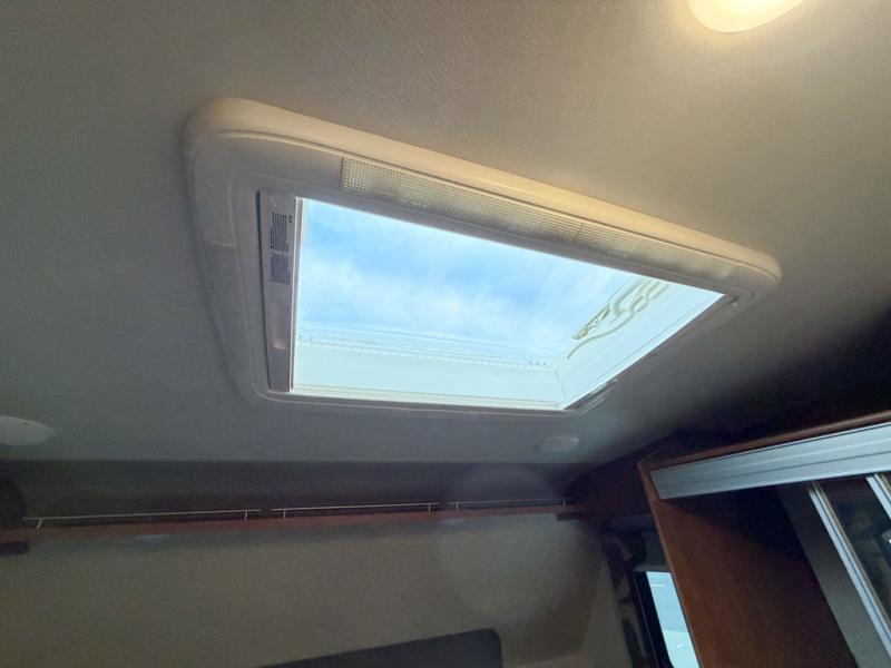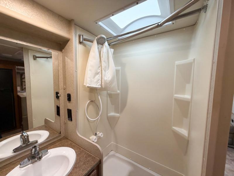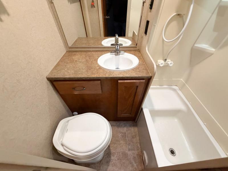 The bath is located toward the step up in front and features a tub/shower, toilet and sink. There is also a mirrored door medicine cabinet, and skylight for added light inside, plus a bit of storage.