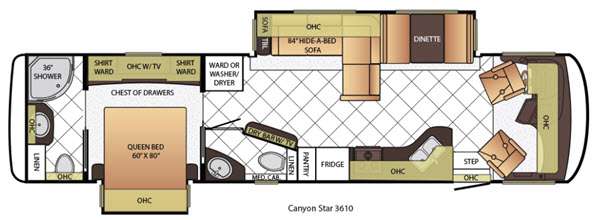 The Canyon Star 3610 motor home by Newmar offers two slides and a bath and a half.