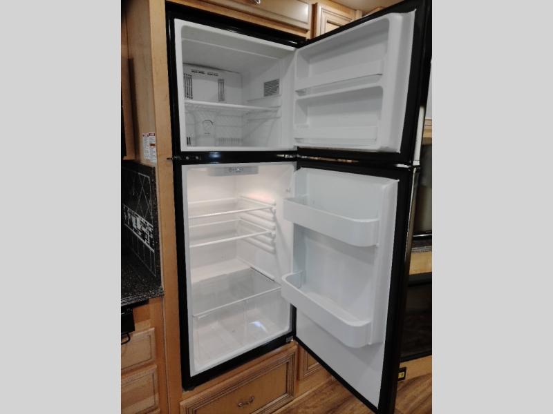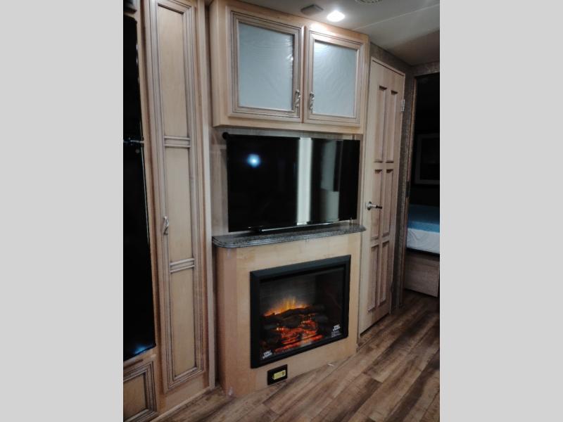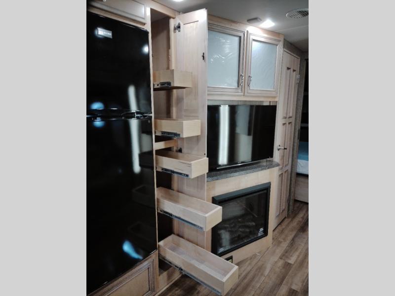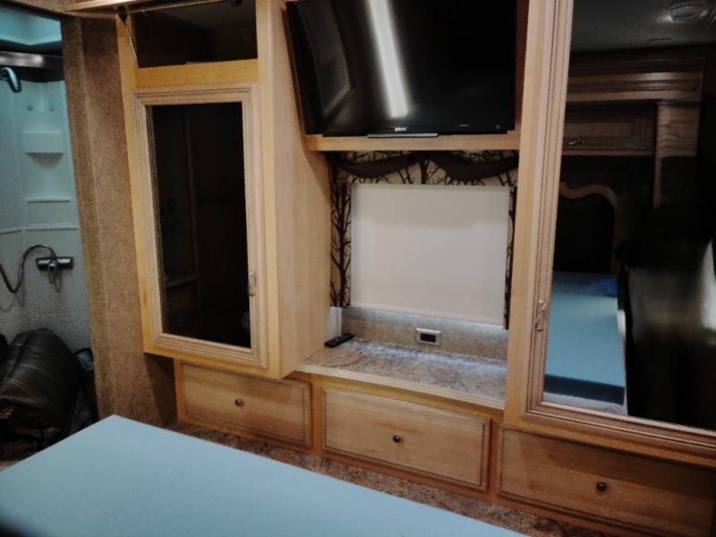 As you enter the 3610, to the left is a double kitchen sink, three burner range, refrigerator, pantry, and linen cabinet. Next to the linen is a dry bar with a TV. The opposite side has a slide with a dinette, sofa, and end table slide. Next to the slide is a wardrobe, which provides added space.