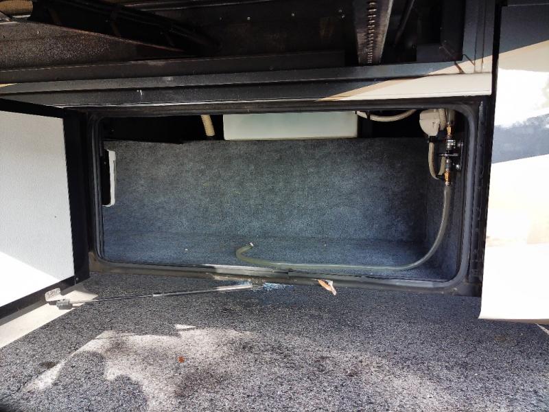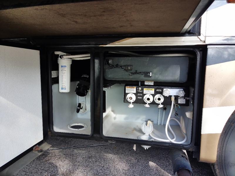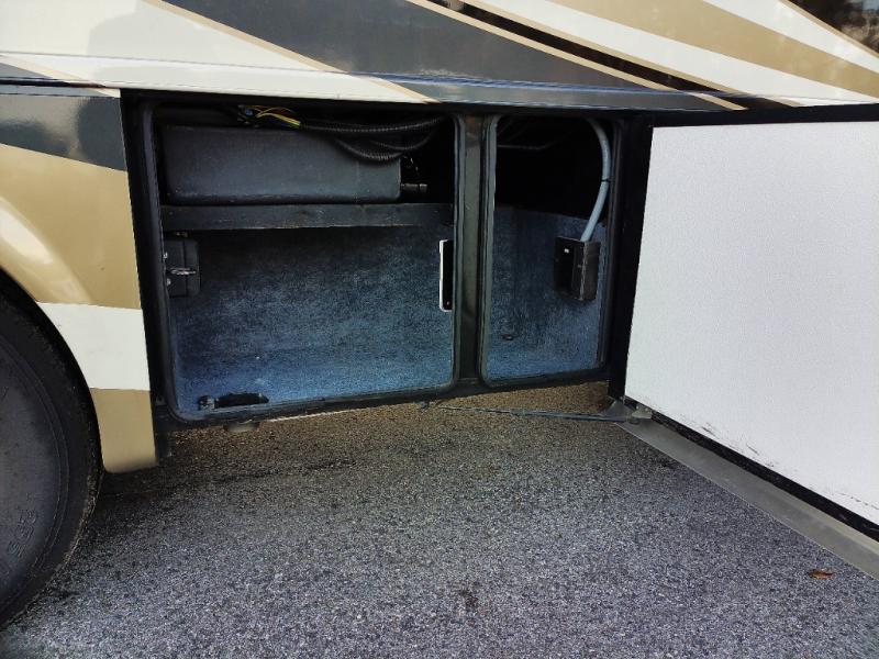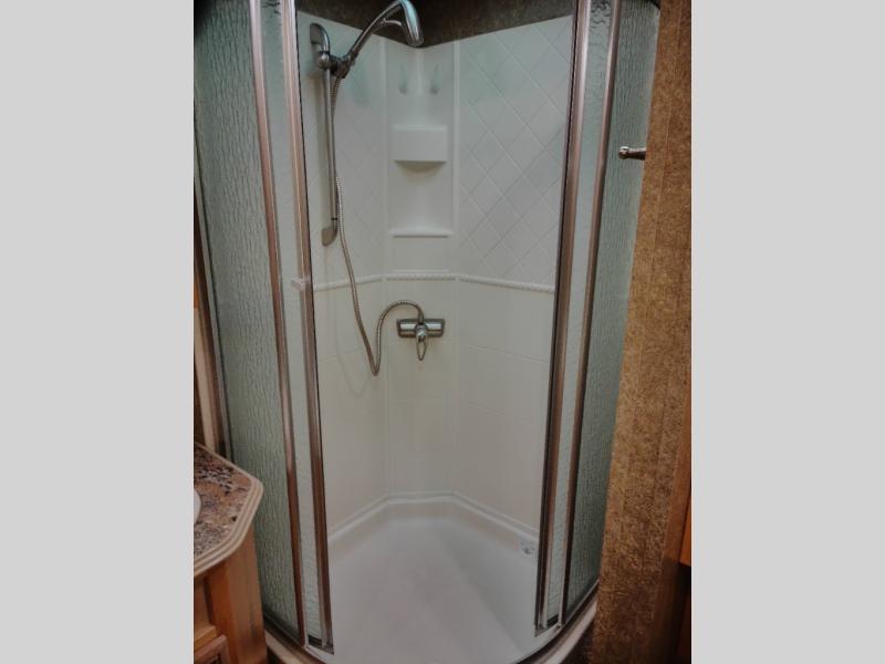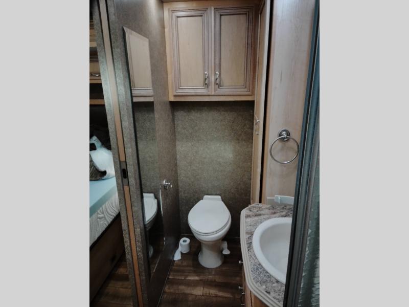 In the very rear of the motor home, you will find a master bath with a shower, sink, linen cabinet, and toilet.