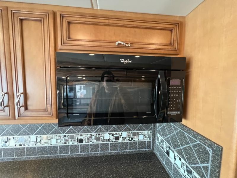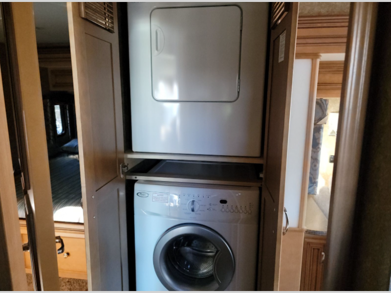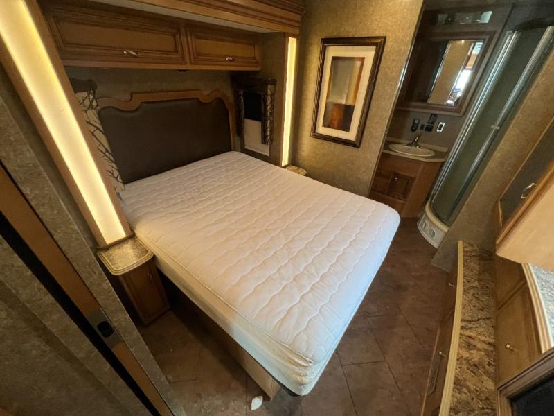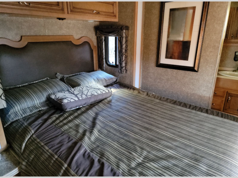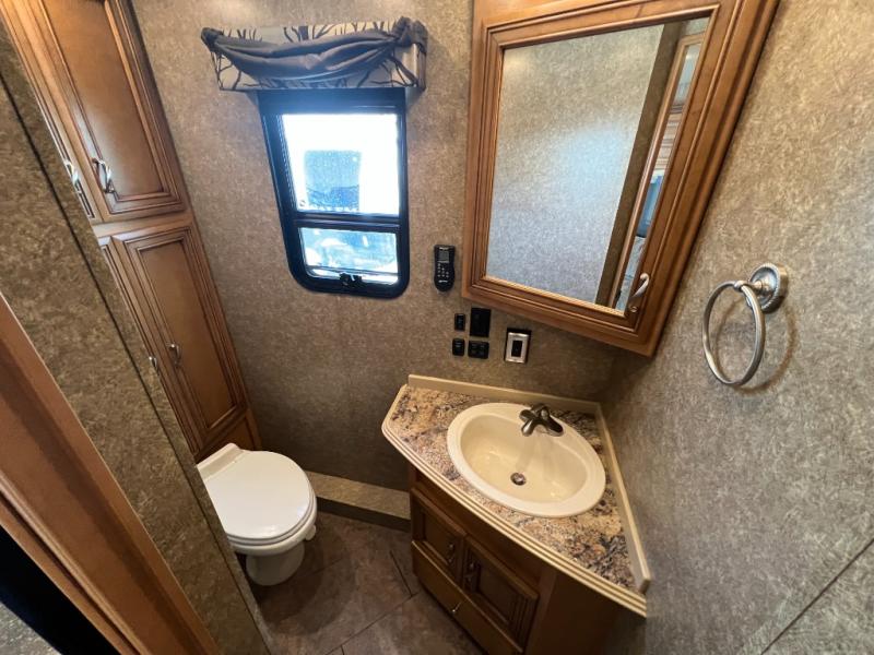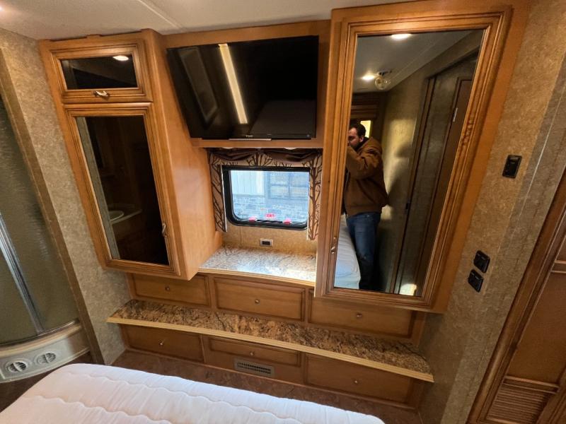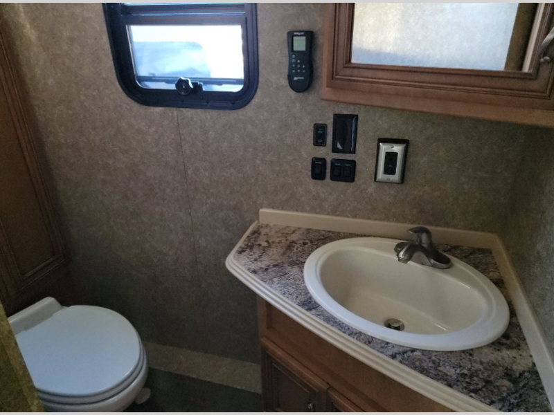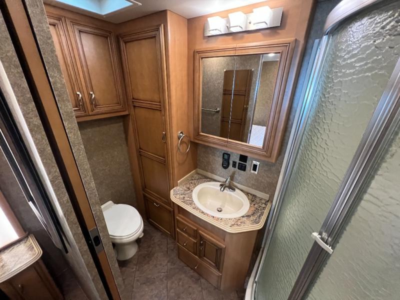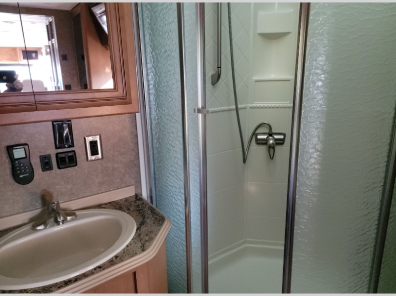 In the very rear of the motor home, you will find a master bath with a shower, sink, linen cabinet, and toilet.