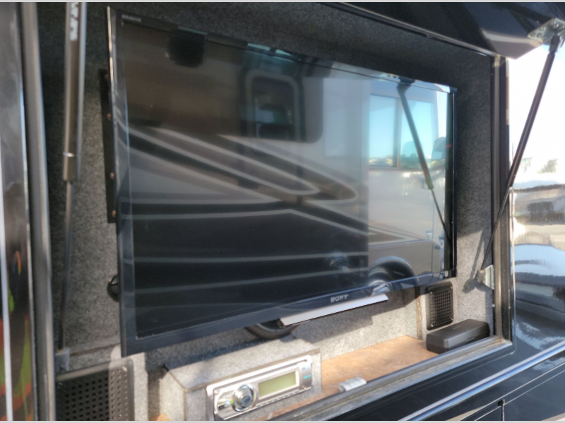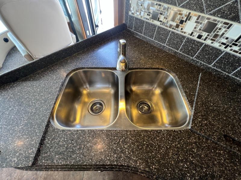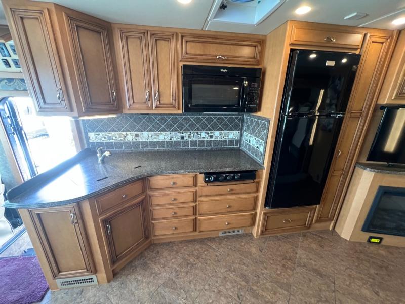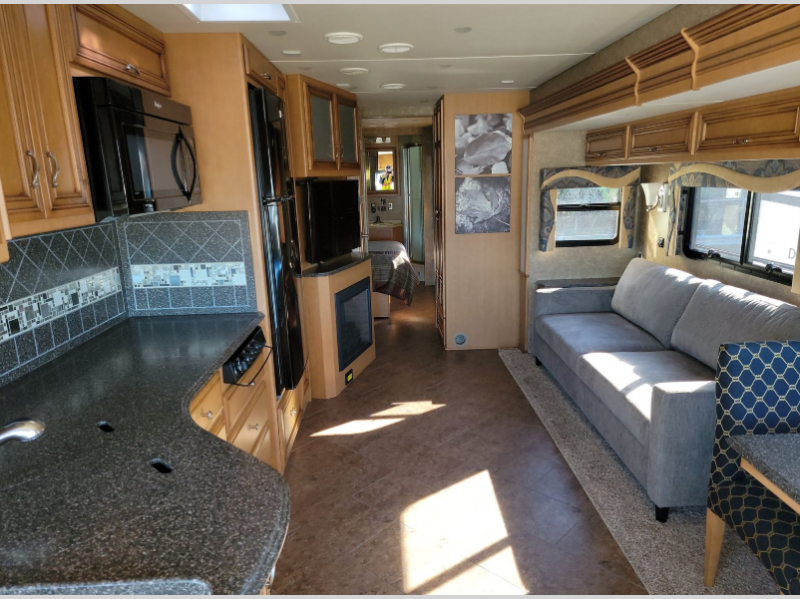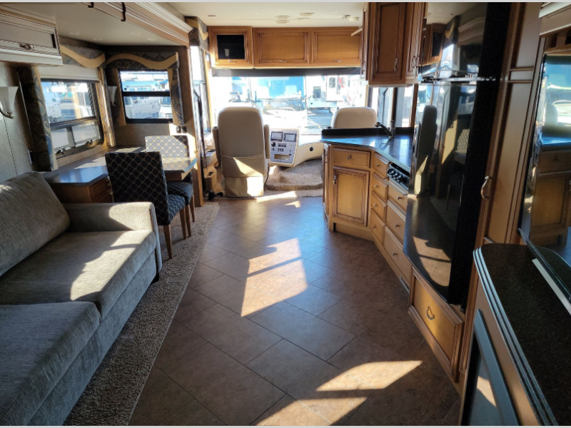 As you enter the 3610, to the left is a double kitchen sink, three burner range, refrigerator, pantry, and linen cabinet. Next to the linen is a dry bar with a TV. The opposite side has a slide with a dinette, sofa, and end table slide. Next to the slide is a wardrobe, which provides added space.