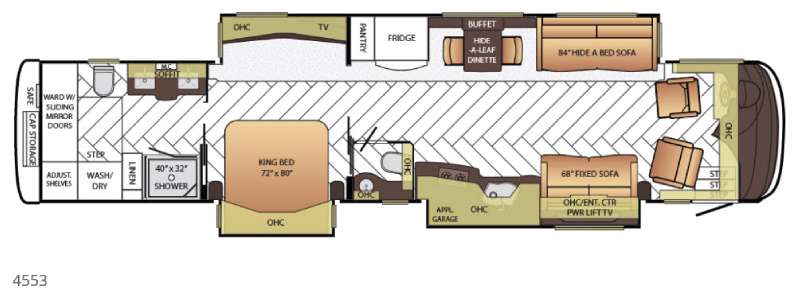 As you enter the motor home, to the left there is a slide with a fixed sofa, sink, and two burner range. The other side of the motor home offers a wall slide. The slide has a hide-a-bed sofa, hide-a-leaf dinette, refrigerator, pantry, and TV in the bedroom. The bedroom also offers a king bed slide.