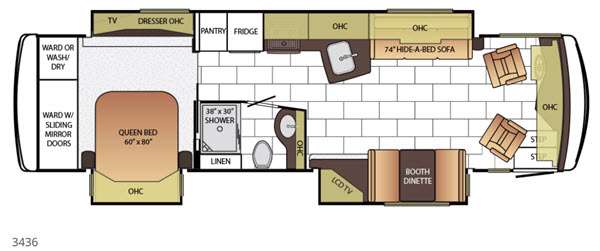 Stepping inside the Ventana 3436 motor home by Newmar, you will be wowed by the space and beauty. You will immediately notice two of the three slides. The first slide is to the left and has a booth dinette and LCD TV. The opposite side of the motor home offers a full wall slide with a hide-a-bed sofa, double kitchen sink, three burner range, refrigerator, pantry, and in the bedroom, a dresser and TV.