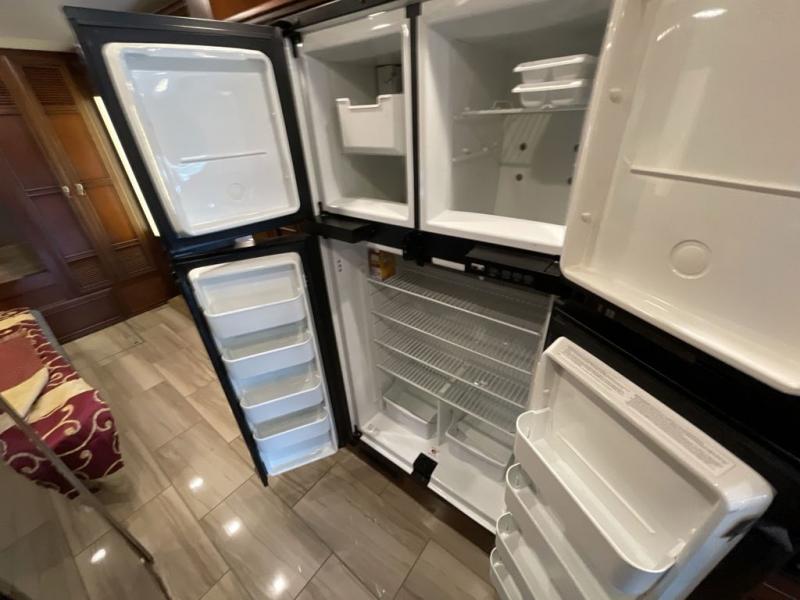 As you enter the motor home, the full wall slide has a dinette, buffet, overhead TV, large sink, three burner range, refrigerator, pantry, dresser, and TV.