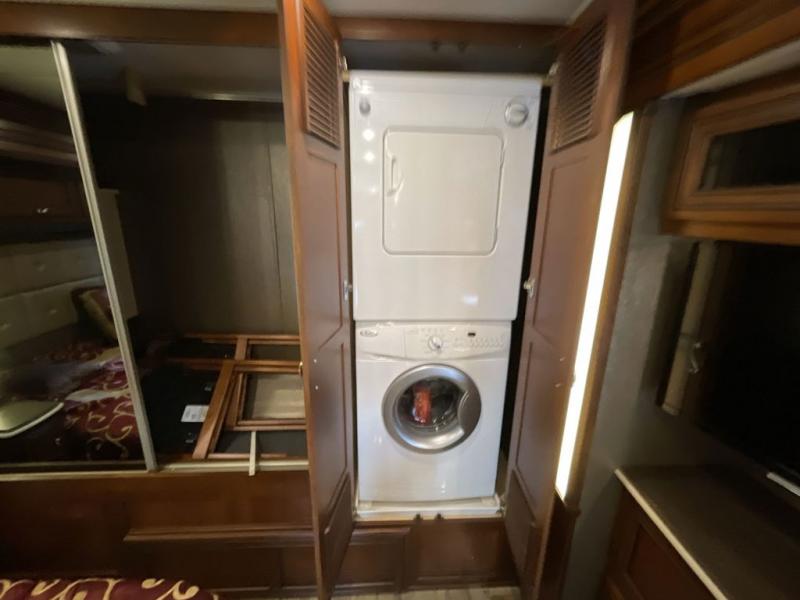 The rear bedroom has a king bed slide with nightstands on either side of the bed. Along the rear of the motor home there is a large wardrobe with sliding mirror doors and an optional washer and dryer.