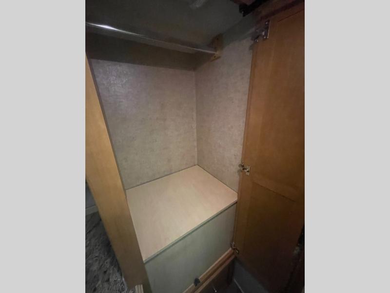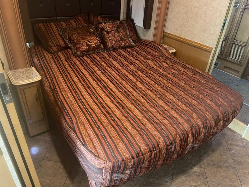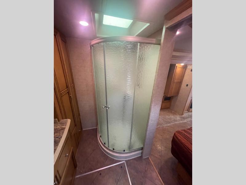 The rear bedroom has a queen bed slide with nightstands on either side of the bed. Off of the bedroom there is a large master bath with a 36" shower, wardrobe with bi-fold doors, sink, wardrobe or washer and dryer, and toilet.
