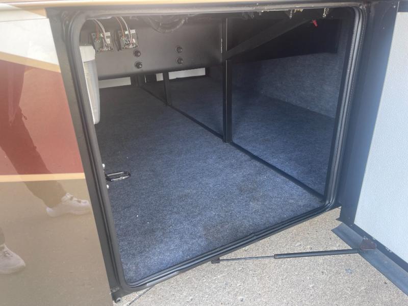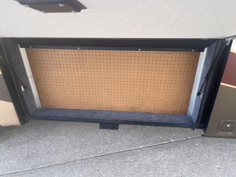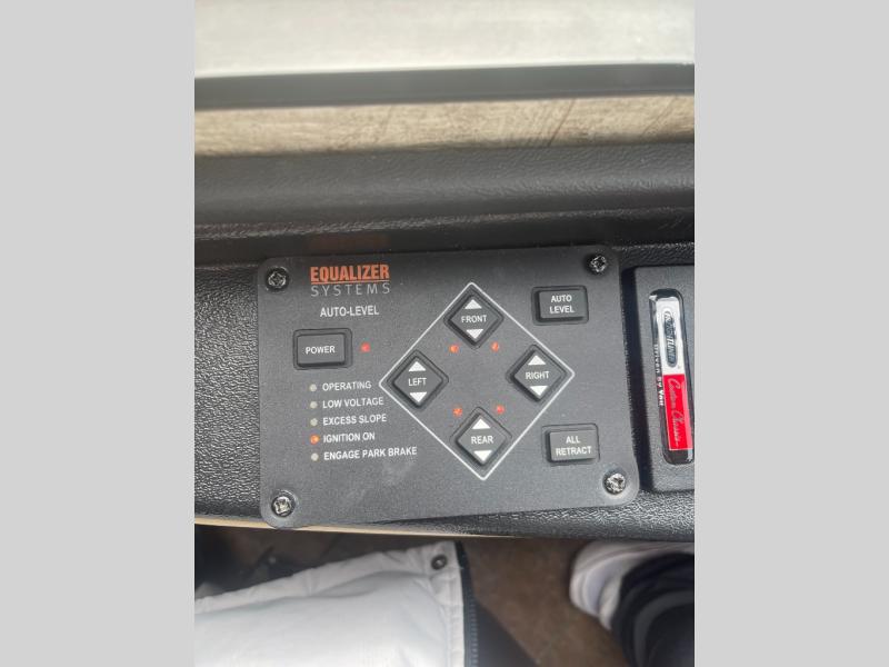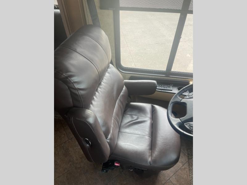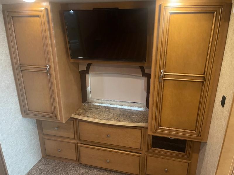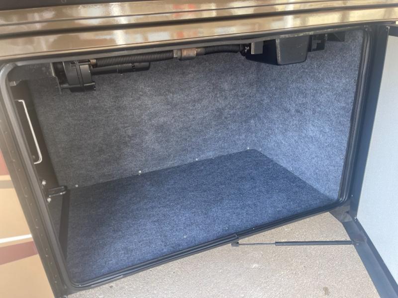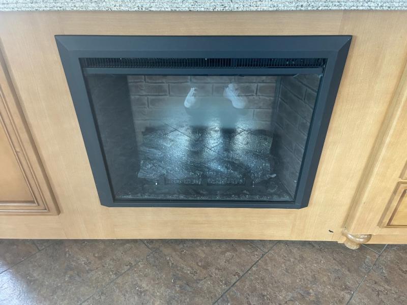 Both the driver and passenger seat easily swivel around to provide more seating in the living area. On the curb side of the motor home you will find a fireplace, LED TV on powerlift, three burner range, and large sink.