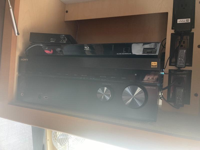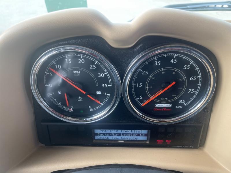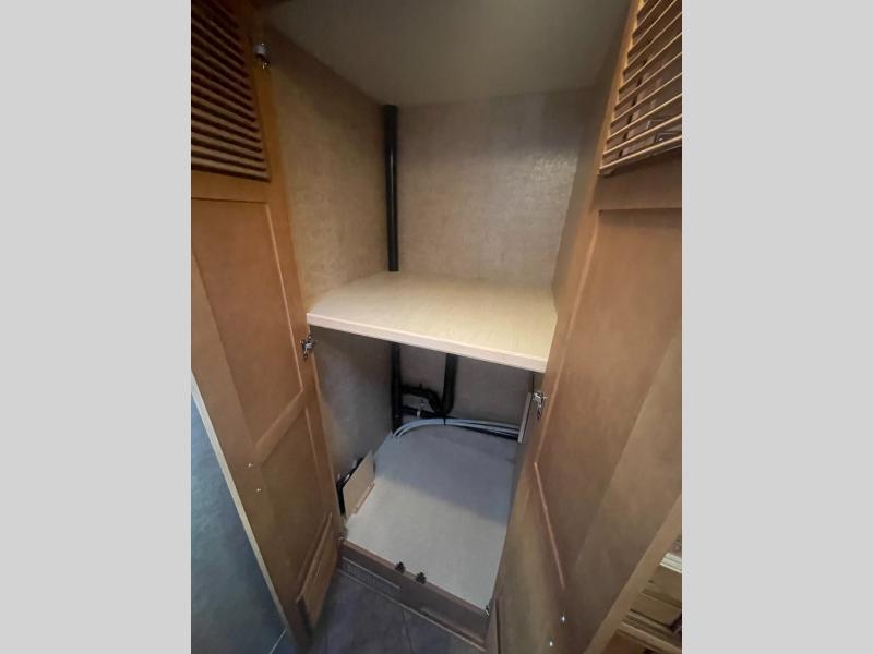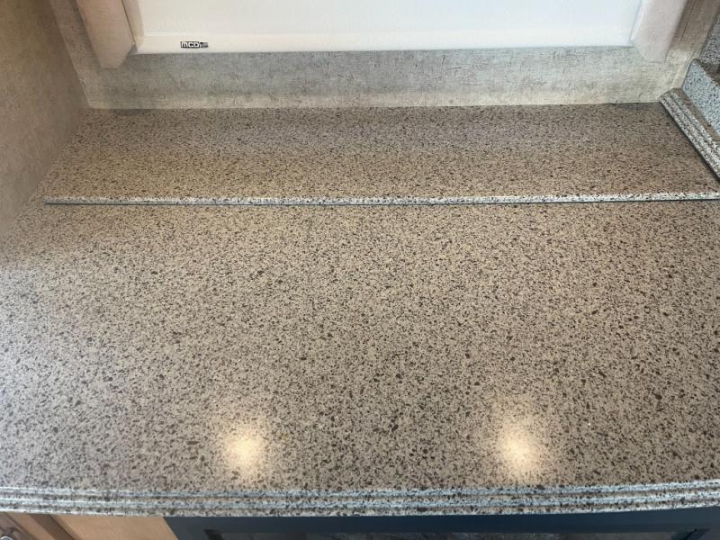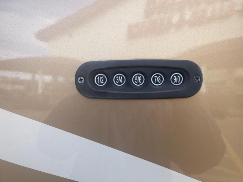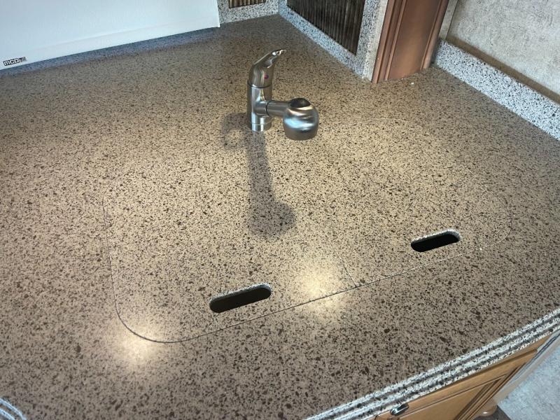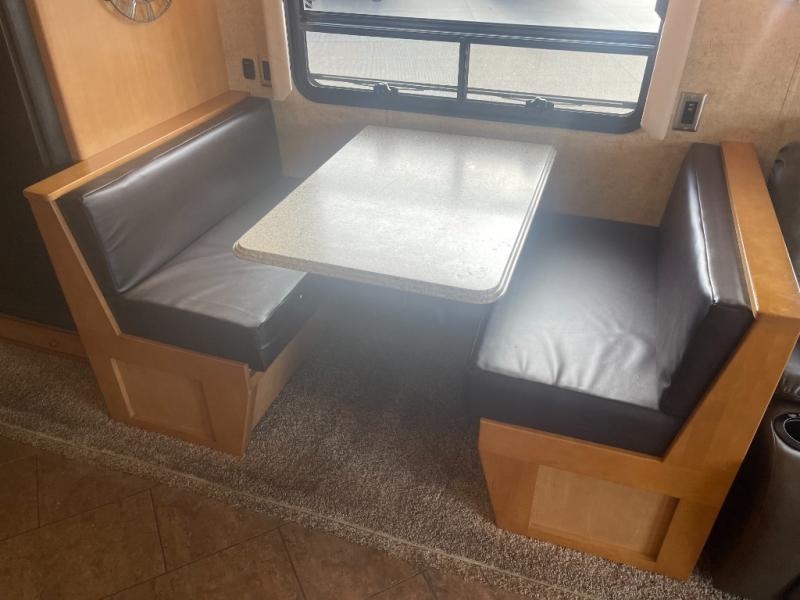 Both the driver and passenger seat easily swivel around to provide more seating in the living area. On the curb side of the motor home you will find a fireplace, LED TV on powerlift, three burner range, and large sink.