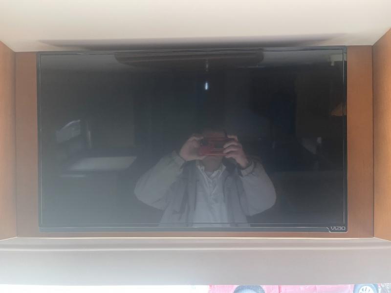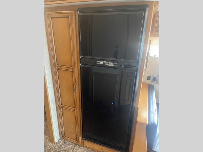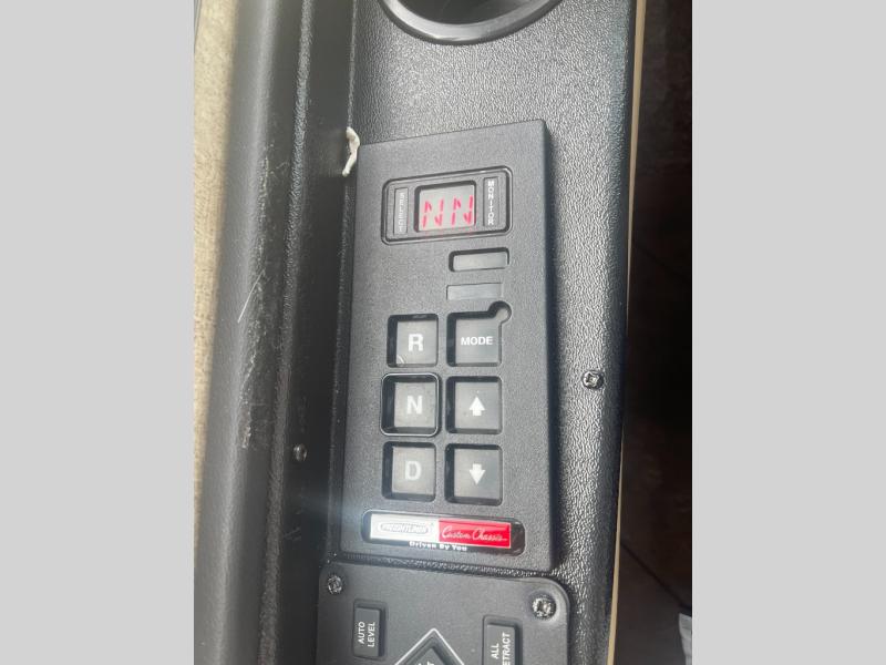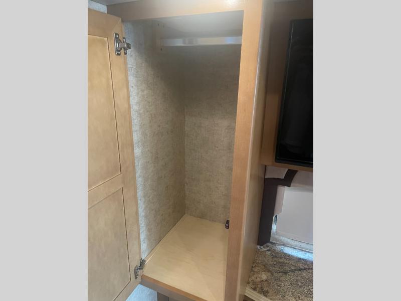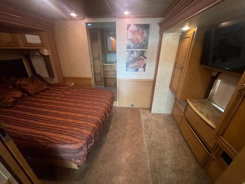 As you enter the motor home, the full wall slide has a hide-a-bed sofa, booth dinette, refrigerator, pantry, two wardrobes a chest of drawers, and an overhead TV.