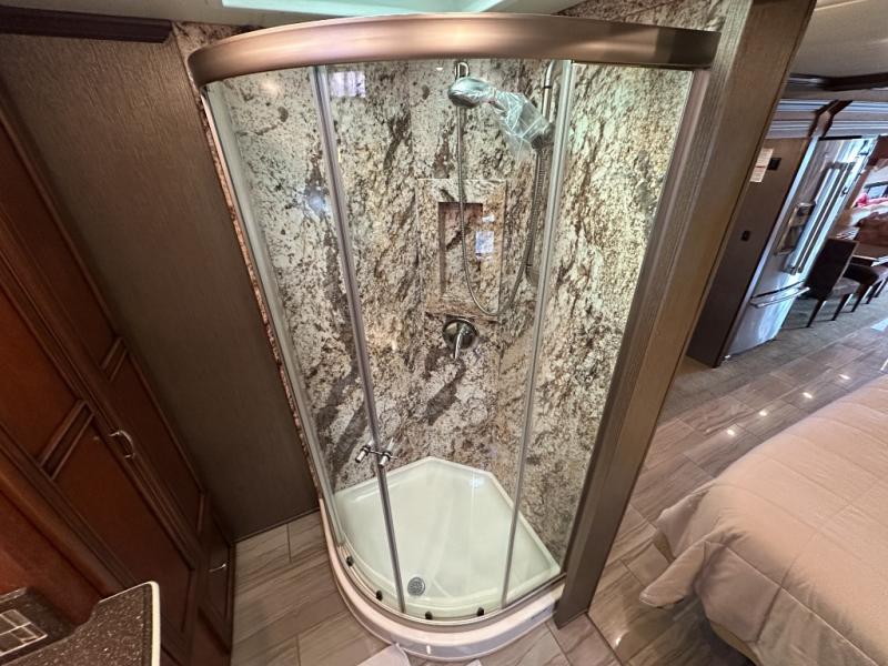 The half bath is down the hall. The rear bedroom has a king bed slide. The master bath offers a toilet, sink, wardrobe, and corner shower. There is a full wall slide with two wardrobes, a chest of drawers, overhead TV, pantry, refrigerator, booth dinette, and hide-a-bed sofa.
