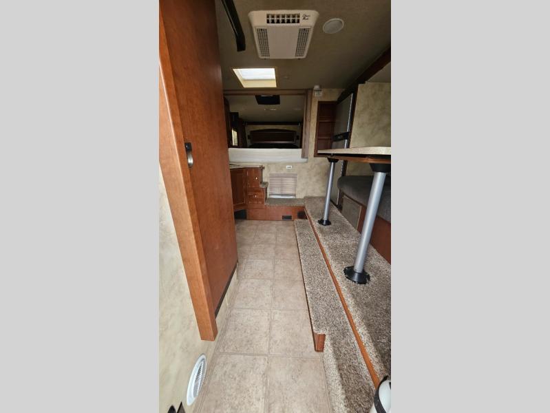 Across, take one step up to the slide out including a booth dinette with an optional overhead bunk and a refrigerator.