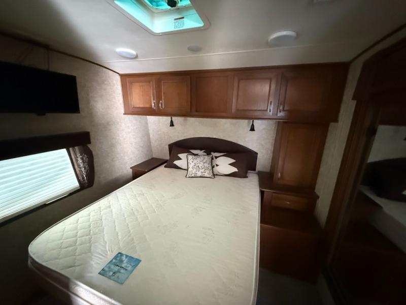 In front enjoy a relaxing space to catch a great nights sleep on a queen size bed, dual nightstands, and a slide out wardrobe along the curb side, and an additional wardrobe along the inside wall, plus so much more!