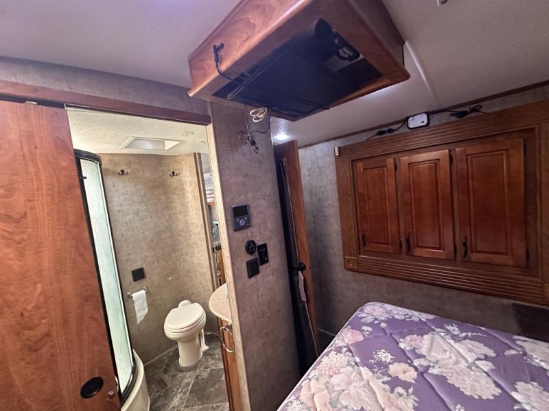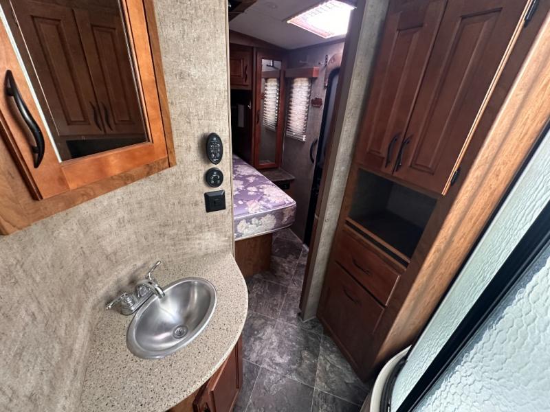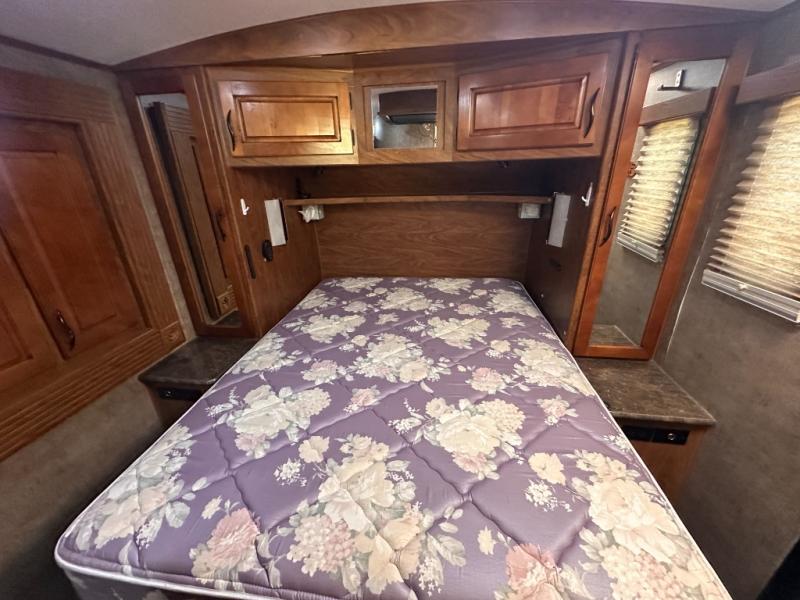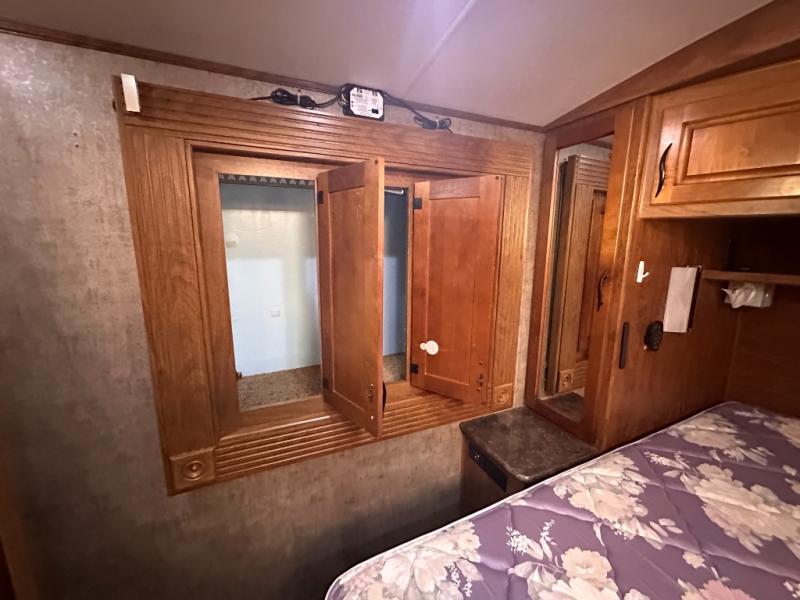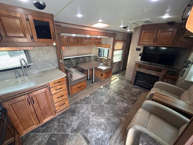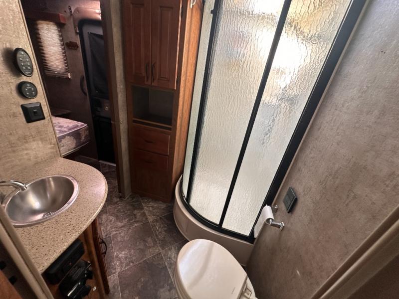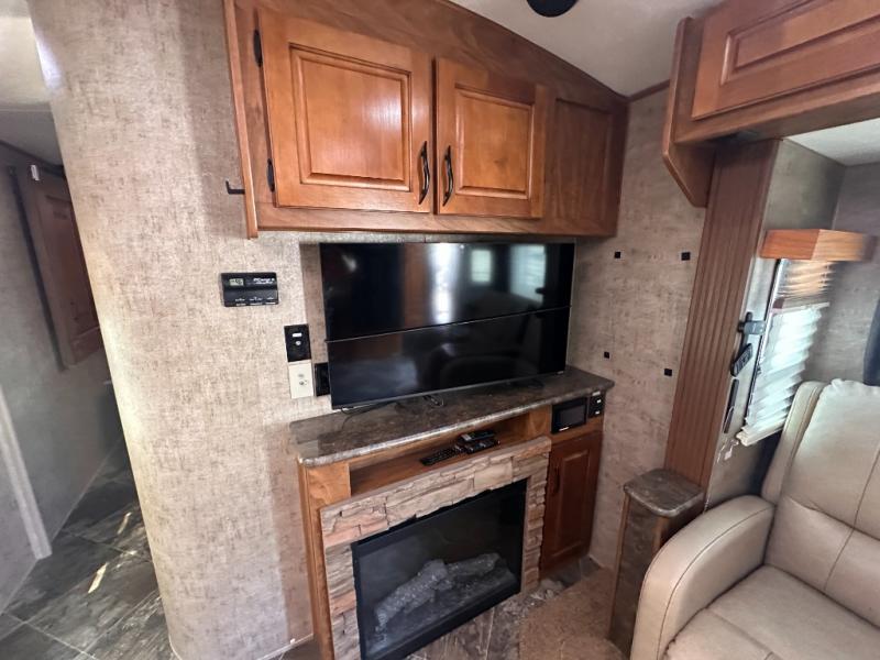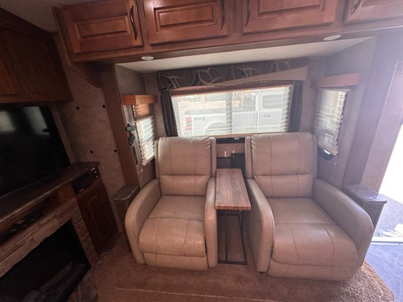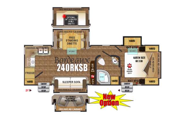 An opposite slide with a sleeper sofa and more overhead cabinets really opens up the interior floor space. Or in place of the sofa you may choose to have opitonal lounge recliners. The front wall, next to the sofa, includes an entertainment center and fireplace along with a 42" TV.