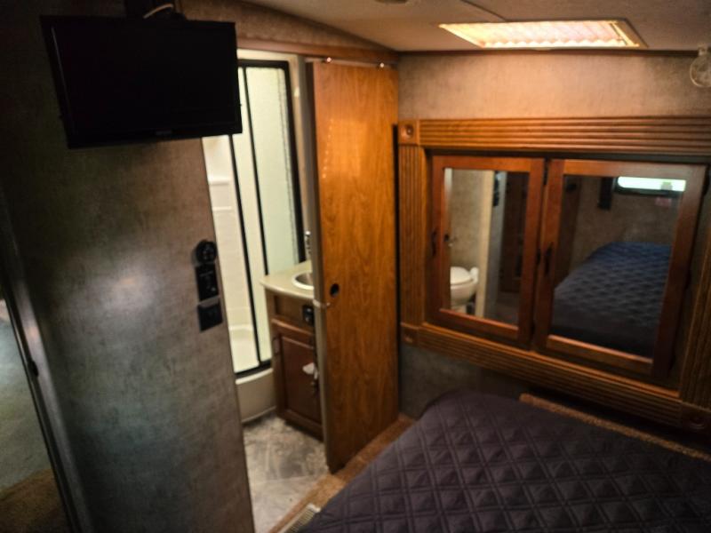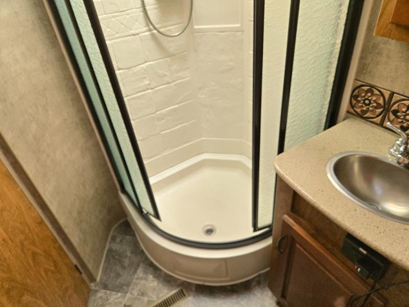 As you step inside you will find two lounge recliners along the rear wall with an end table between and overhead storage the entire width of the unit. There is a sleeper sofa and u-shaped dinette slide straight ahead with storage above the sofa. A free standing dinette with four chairs is an optional as well. A skylight is in front of the slide providing plenty of natural light inside. A nearby entertainment center features a 42" Vizio TV, and you can choose to add the optional fireplace for a warm cozy glow at night.