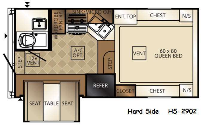 This unit features a single slide out, wet bath, and a queen bed for sleeping.