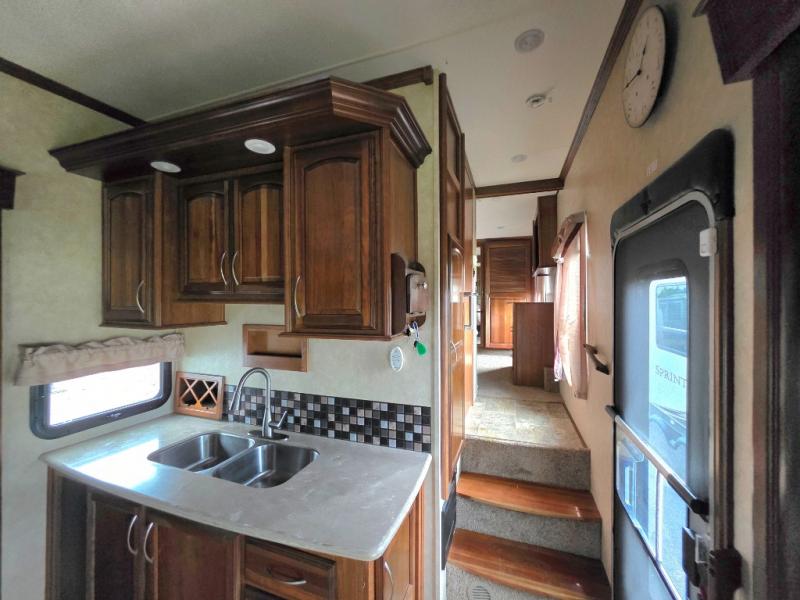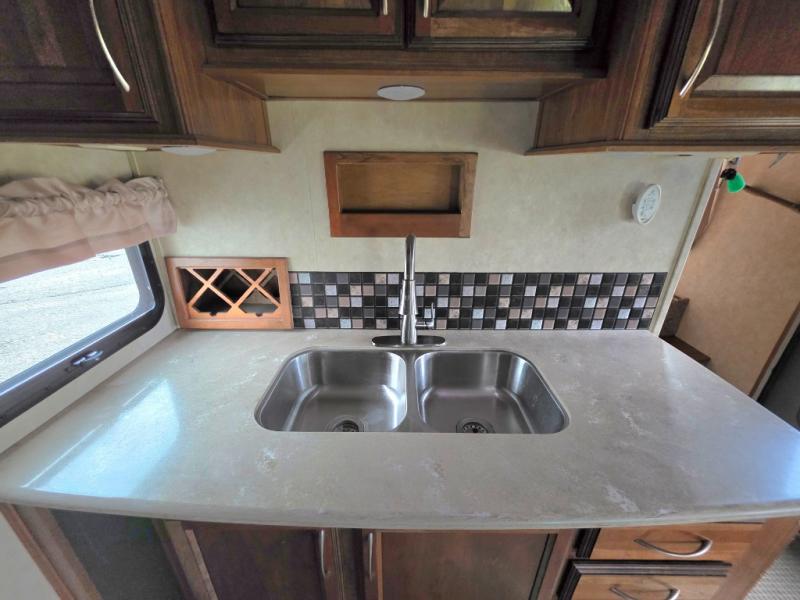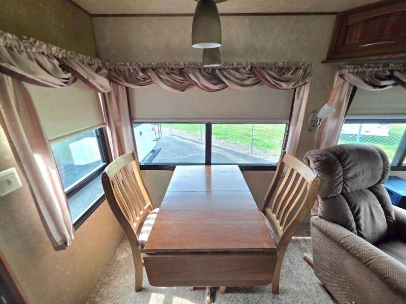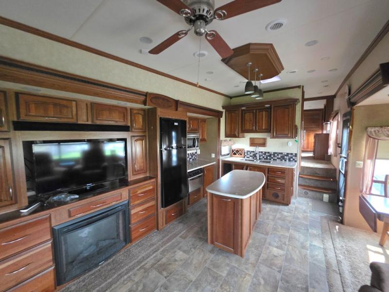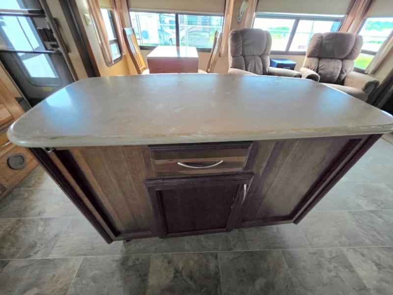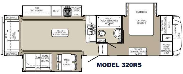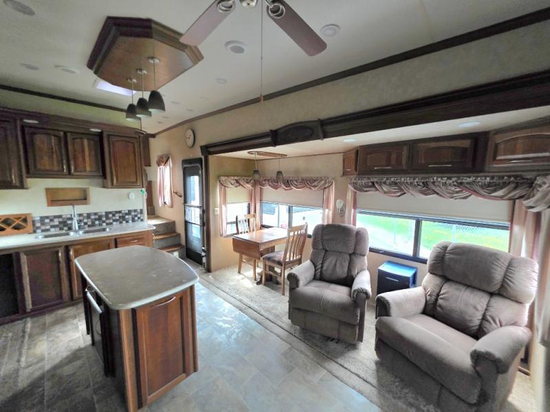 In this Palomino Columbus fifth wheel model 320RS you will find large slide outs to add increased space inside, a rolling kitchen island with storage drawers that you can place where you need it most, and an optional king size bed!