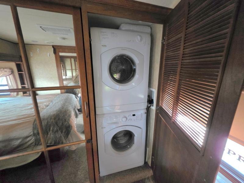 The front bedroom offers a queen bed slide or optional king, with a dresser including an overhead TV box along the opposite wall. There is a closet that has been prepped for a washer and dryer with removable shelf, and a wardrobe with drawers, a linen cabinet, and so much more!