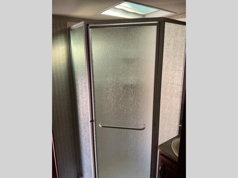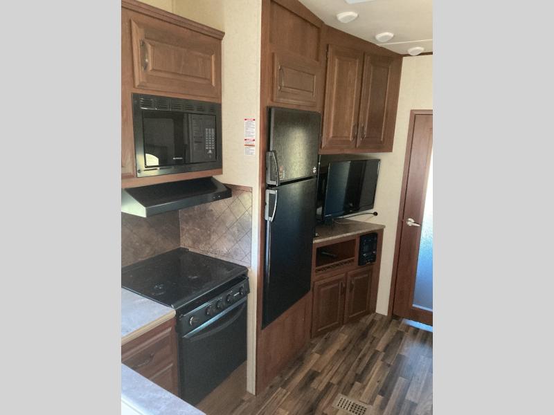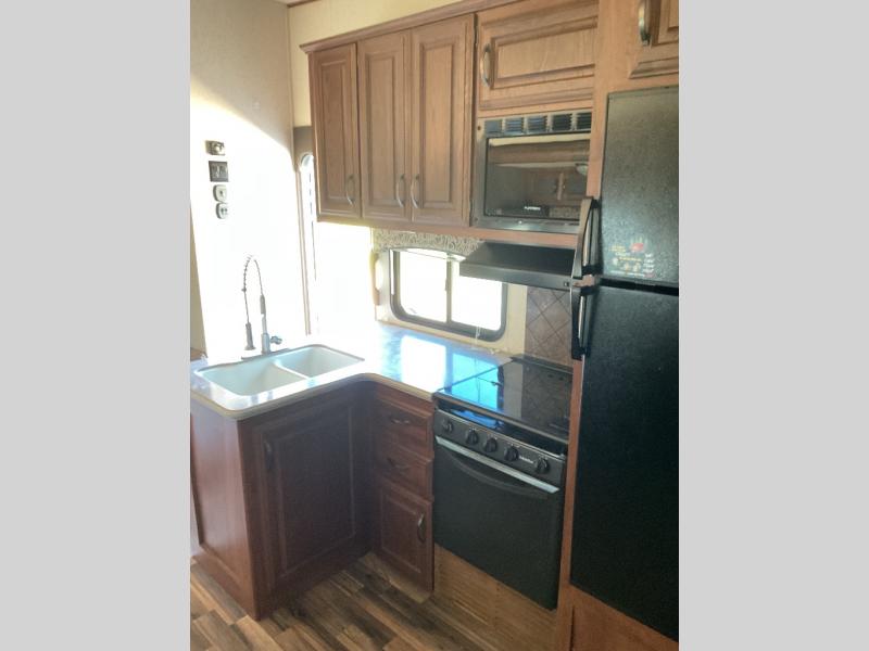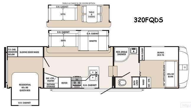 Step inside model 320FQDS and find yourself in the Silhouette kitchen and living space combined. There is a slide out booth dinette and sofa with overhead storage above both. The kitchen features everything you need for providing great meals and snacks. There is a refrigerator, pantry, three burner range with overhead cabinets, and a double sink for easy cleanup.