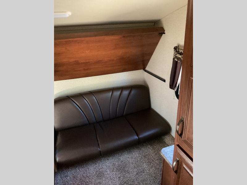The front bunkhouse is beyond the bath and features a wardrobe, entertainment center, 60" Jiffy sofa with 28" x 62" bunk above, plus another set of 30" x 76" bunk beds on the front side wall with a bunk cubby for storage.