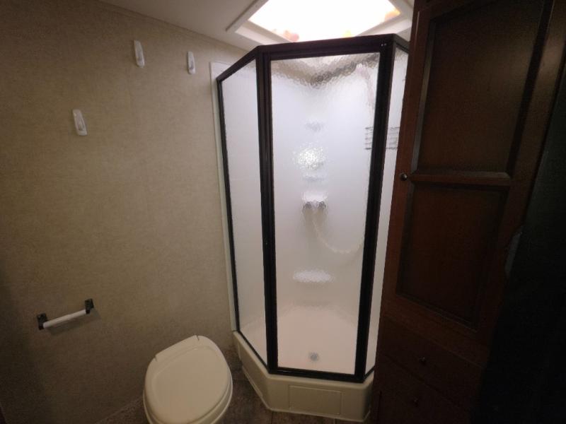 The rear bath features a linen cabinet, radius shower, toilet, wardrobe, and sink.