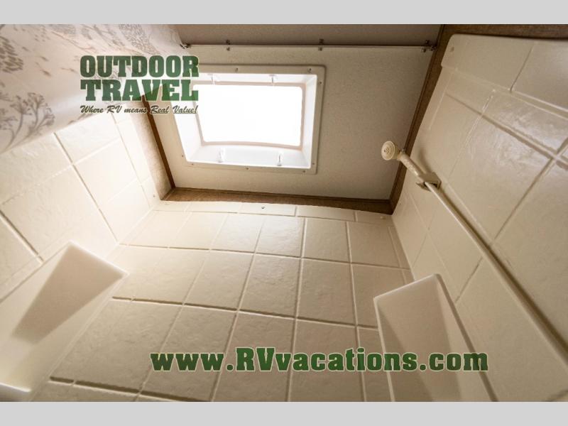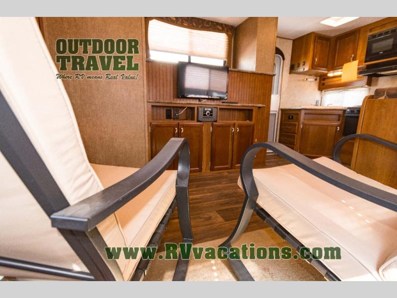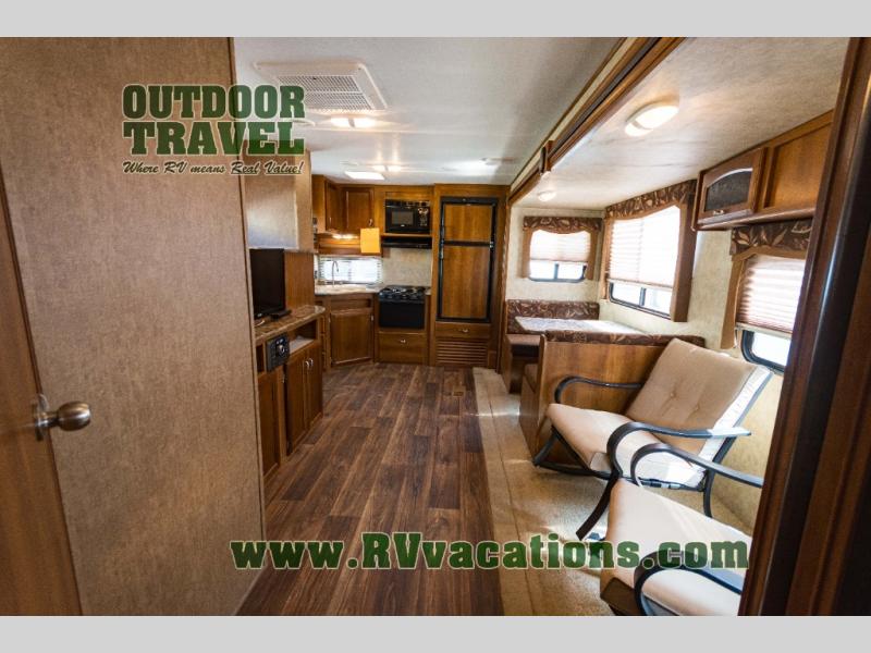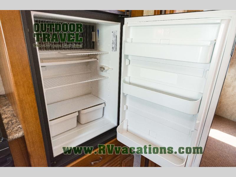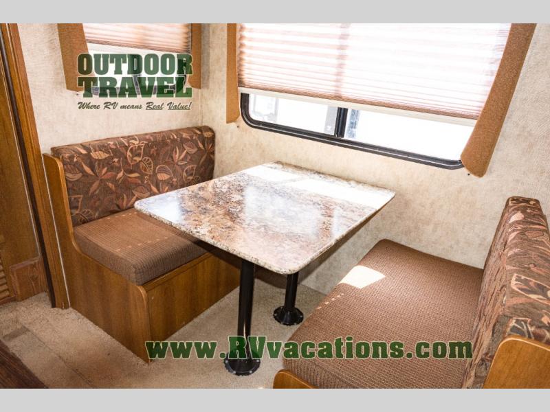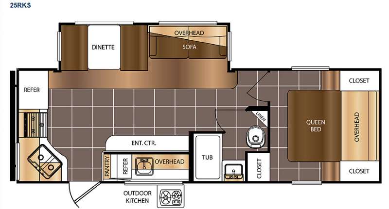 Stepping inside the Avenger 25RKS travel trailer by Prime Time Manufacturing, you will find that the kitchen is located in the rear. Along the rear wall there is a double kitchen sink, three burner range, and refrigerator. The slide has a dinette and a sofa. On the opposite side of the travel trailer you will find an entertainment center.