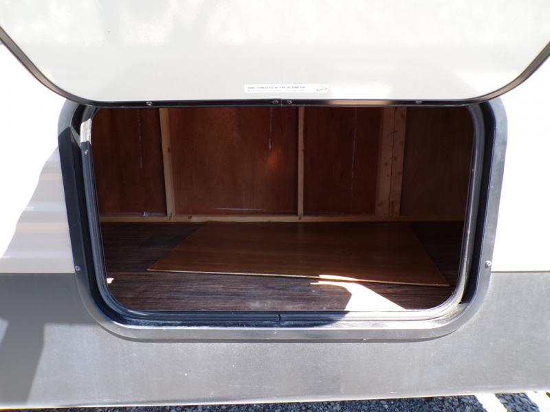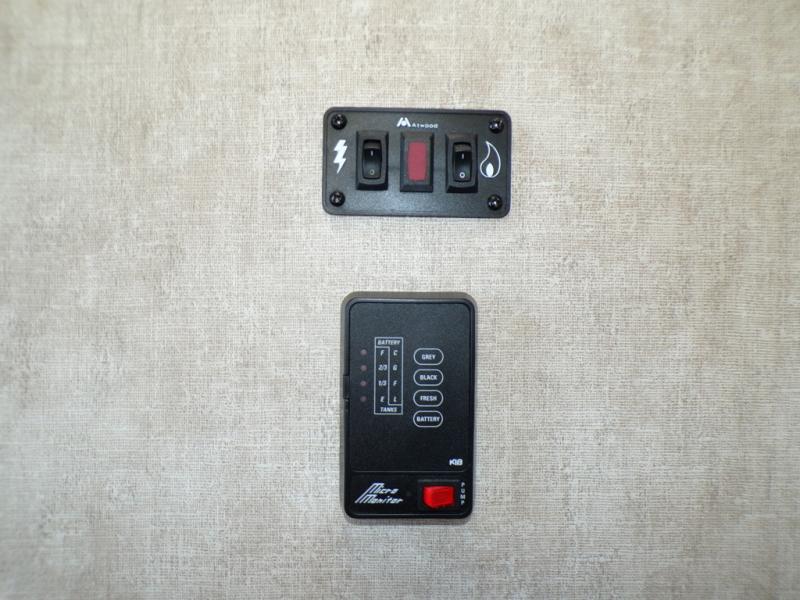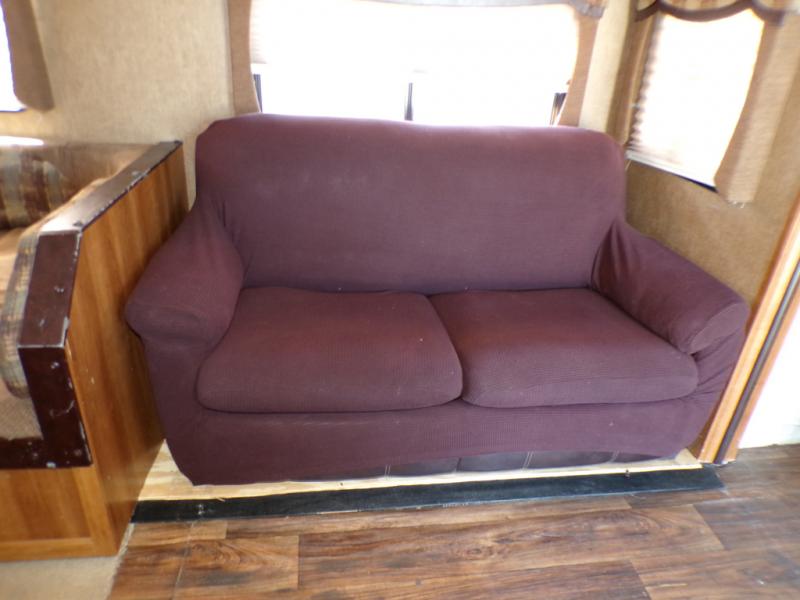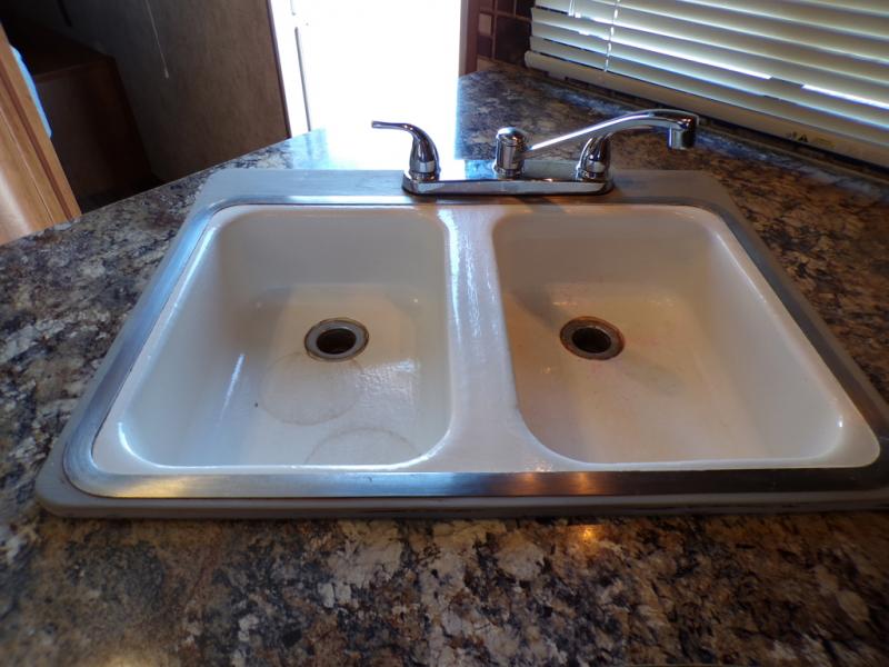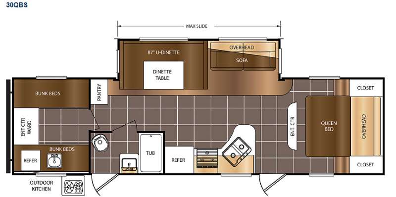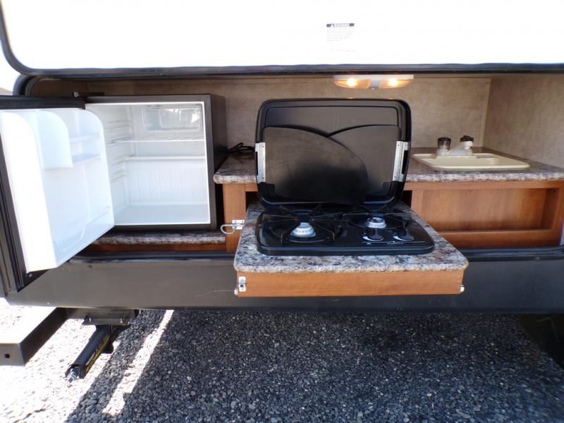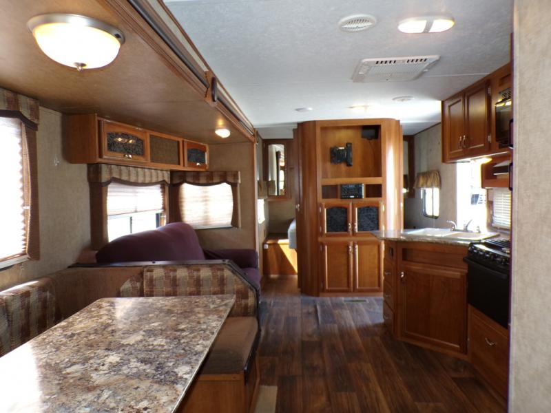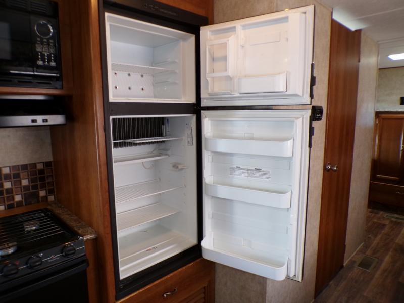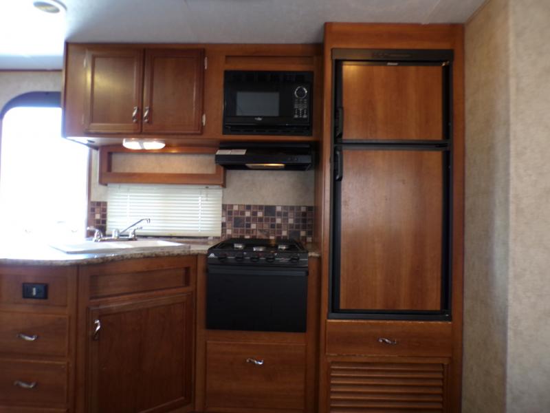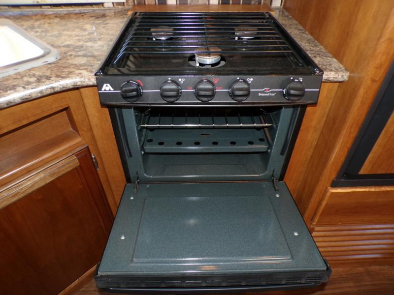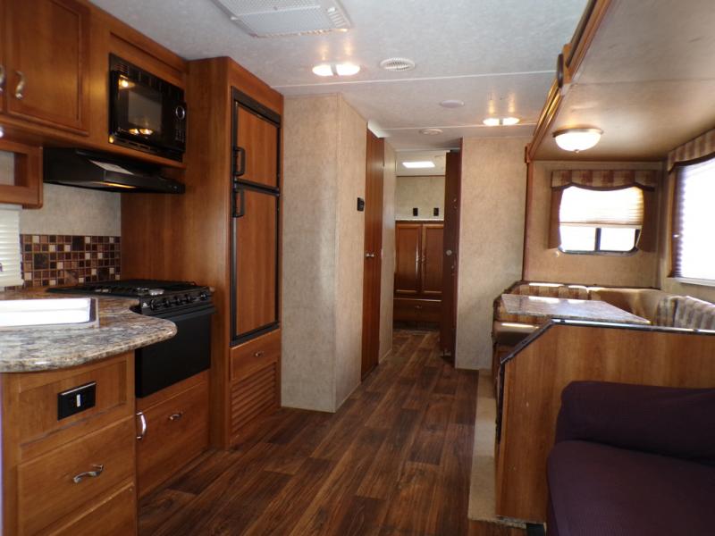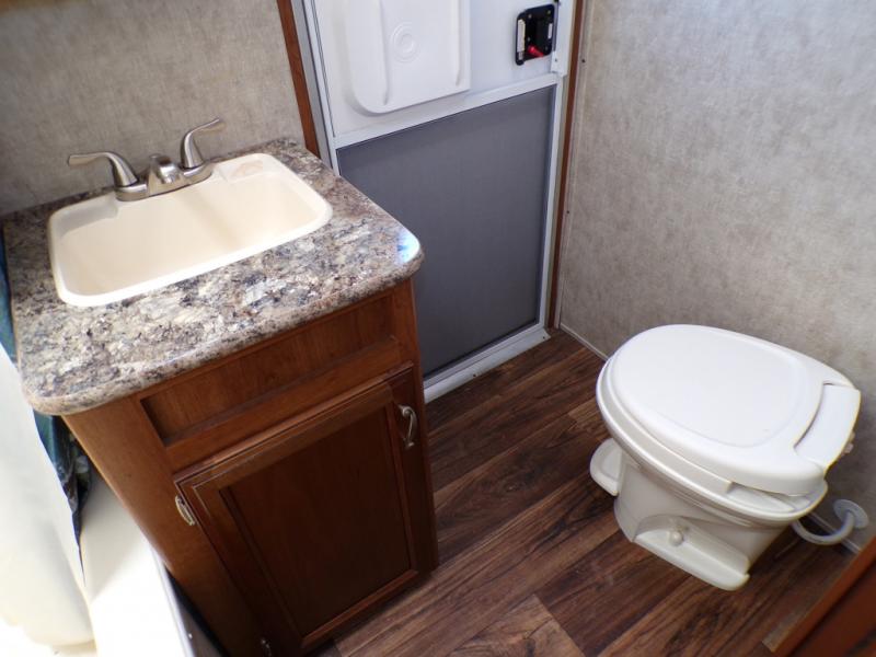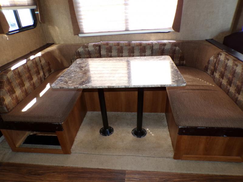 The living and kitchen areas offer an entertainment center, a slide with a sofa and u-dinette and a double kitchen sink, three burner range, and refrigerator. Next to the dinette is a nice size pantry which provides extra storage.