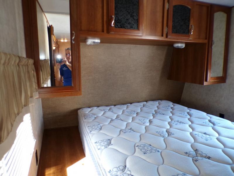 As you enter the travel trailer, to the right is the front bedroom. You will be greeted with a queen bed and closets on either side of the bed.