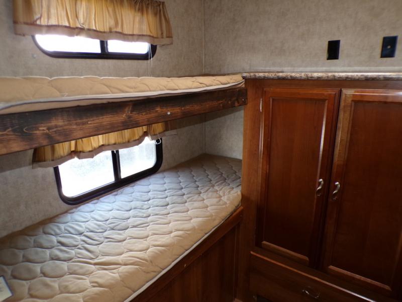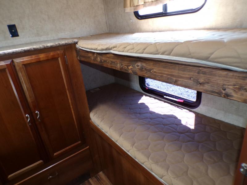 In the rear of the travel trailer you will find a bunk house with three bunks, and entertainment center and a wardrobe.